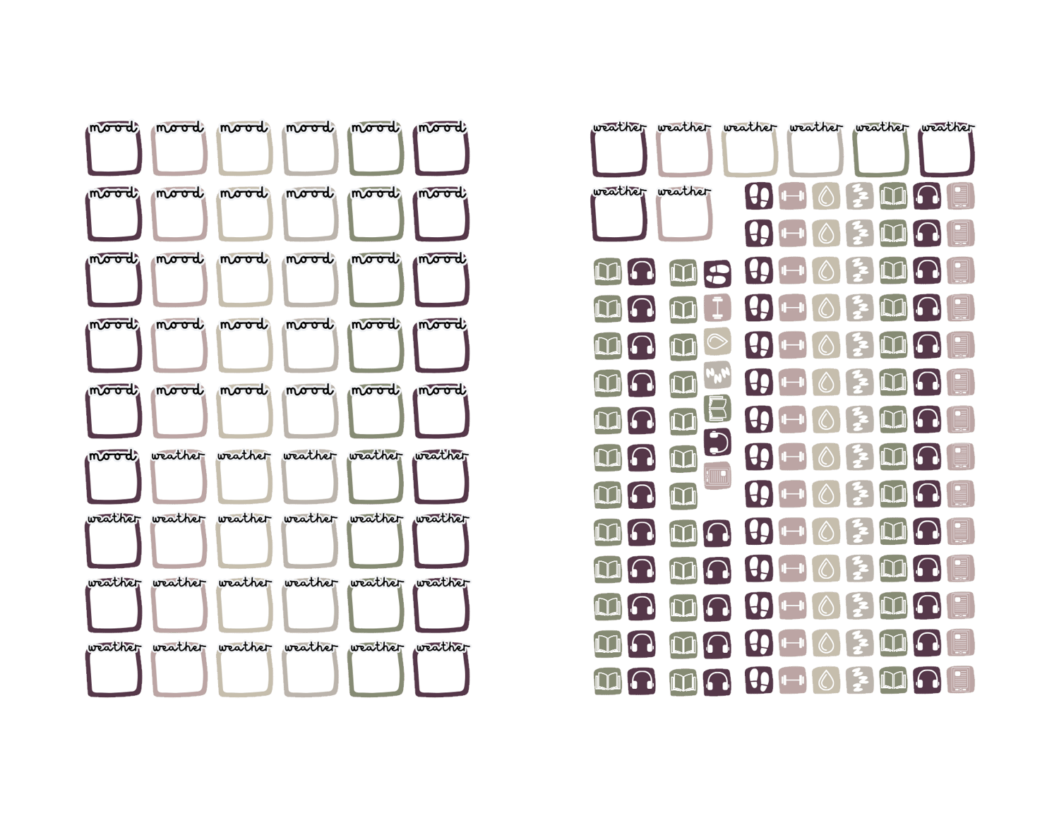 - 31 sets of 7 daily icons: steps, water, sleep, exercise, book, headphones, e‑reader