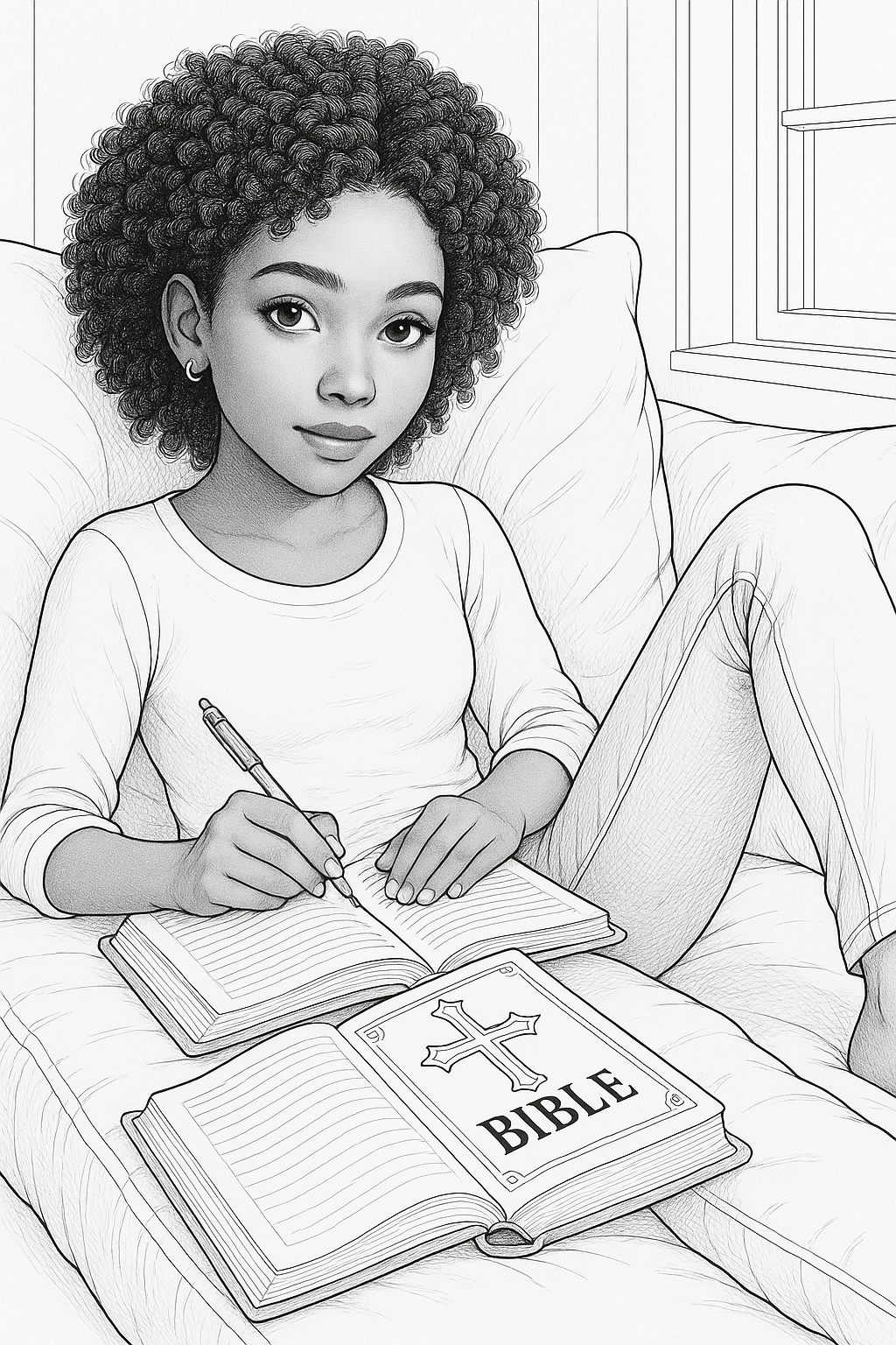 - π§ Young person with curly hair writing in a notebook beside a Bible