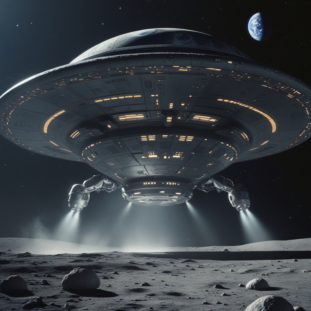 "An enormous alien mothership descending onto the surface of the moon, casting massive shadows across the gray, cratered landscape. The ship is sleek and otherworldly, with glowing energy panels, intricate alien patterns, and hovering mechanical appendages. Dust and moon rocks are kicked up around the landing site, with faint beams of light shining from the ship onto the lunar surface. Earth is visible in the black starry sky above, adding scale and drama. Cinematic, ultra-realistic lighting, high-detail textures, epic sci-fi atmosphere, dramatic perspective emphasizing the massive size of the mothership."
