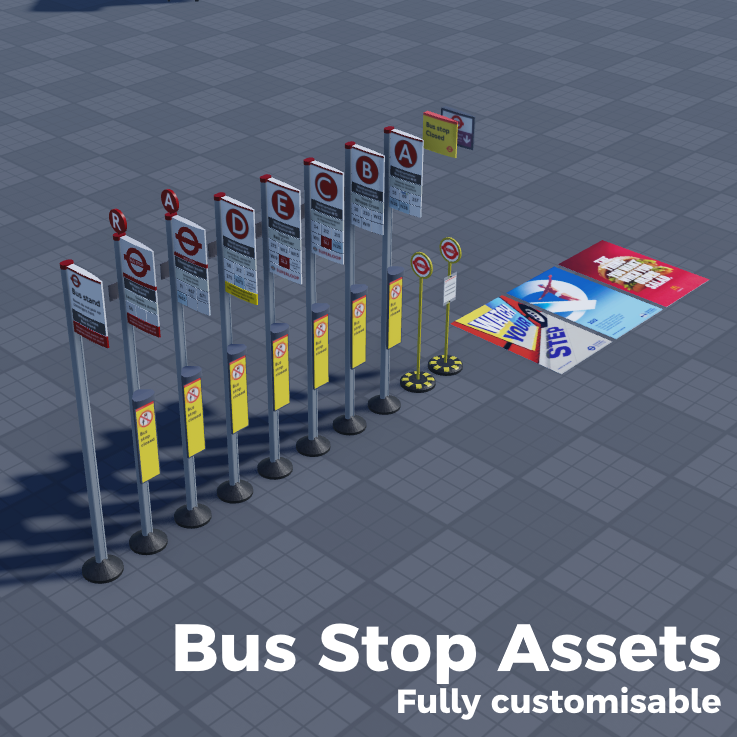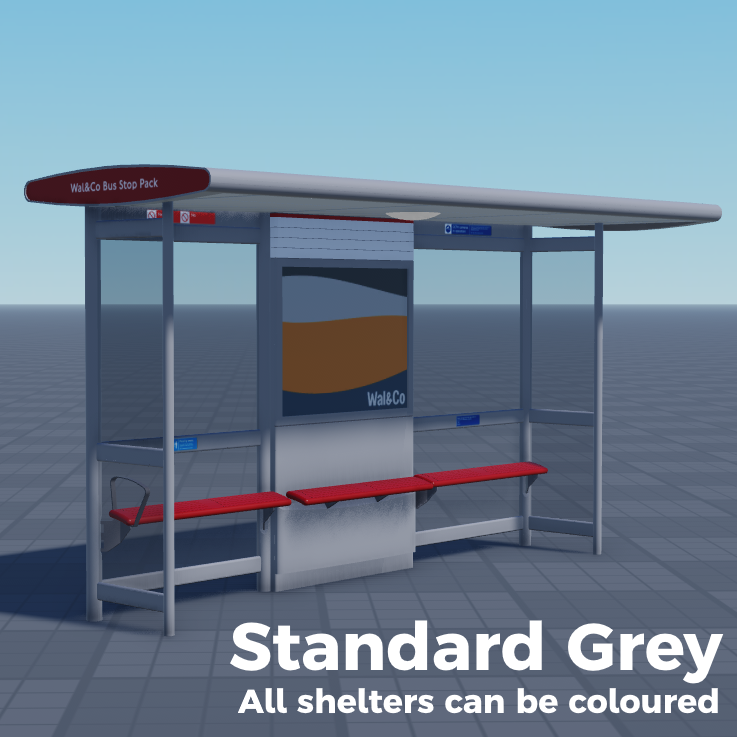 Please note: Provided with this pack is a small selection of example image files that you can use as templates for aspects of the shelter and the bus stop poles including route numbers, stop names etc. If you can't find something you need and feel unable to create it yourself, open a ticket in our Discord server and we may be able to assist you.