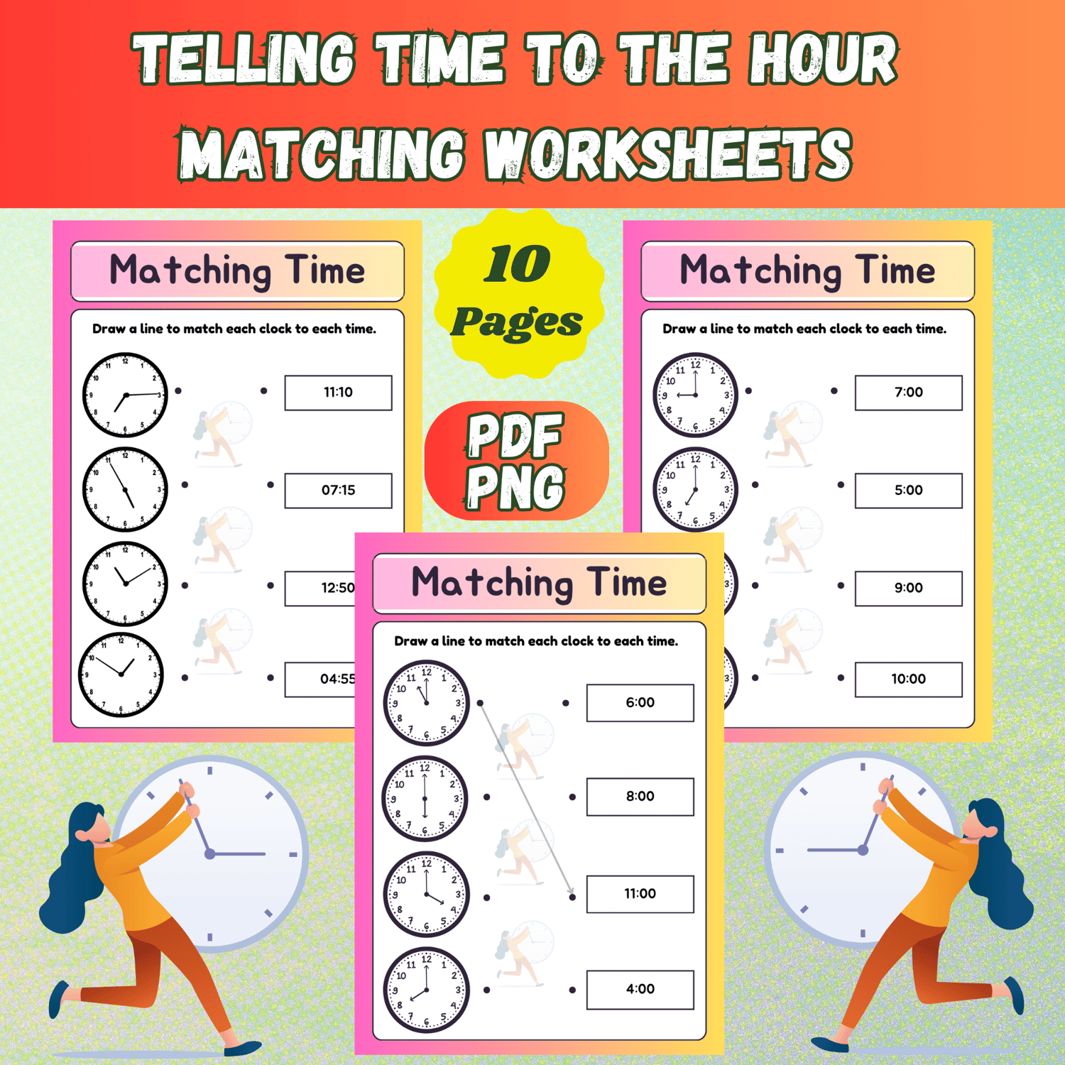 The "Telling Time to the Hour Matching Worksheet" is a printable educational worksheet designed to help children learn and practice telling time to the hour. These worksheets provide an interactive and engaging activity to develop time-telling skills. Each worksheet consists of analog clock faces displaying different times to the hour, and corresponding digital clock representations. Children are tasked with matching the analog clock to its corresponding digital time. This activity helps children understand the relationship between analog and digital time formats and reinforces their ability to read and interpret the hour on a clock face. The "Telling Time to the Hour Matching Worksheets" is a valuable resource for teachers, homeschooling parents, or anyone seeking to support children in mastering this fundamental time-telling skill.