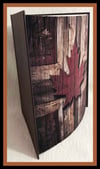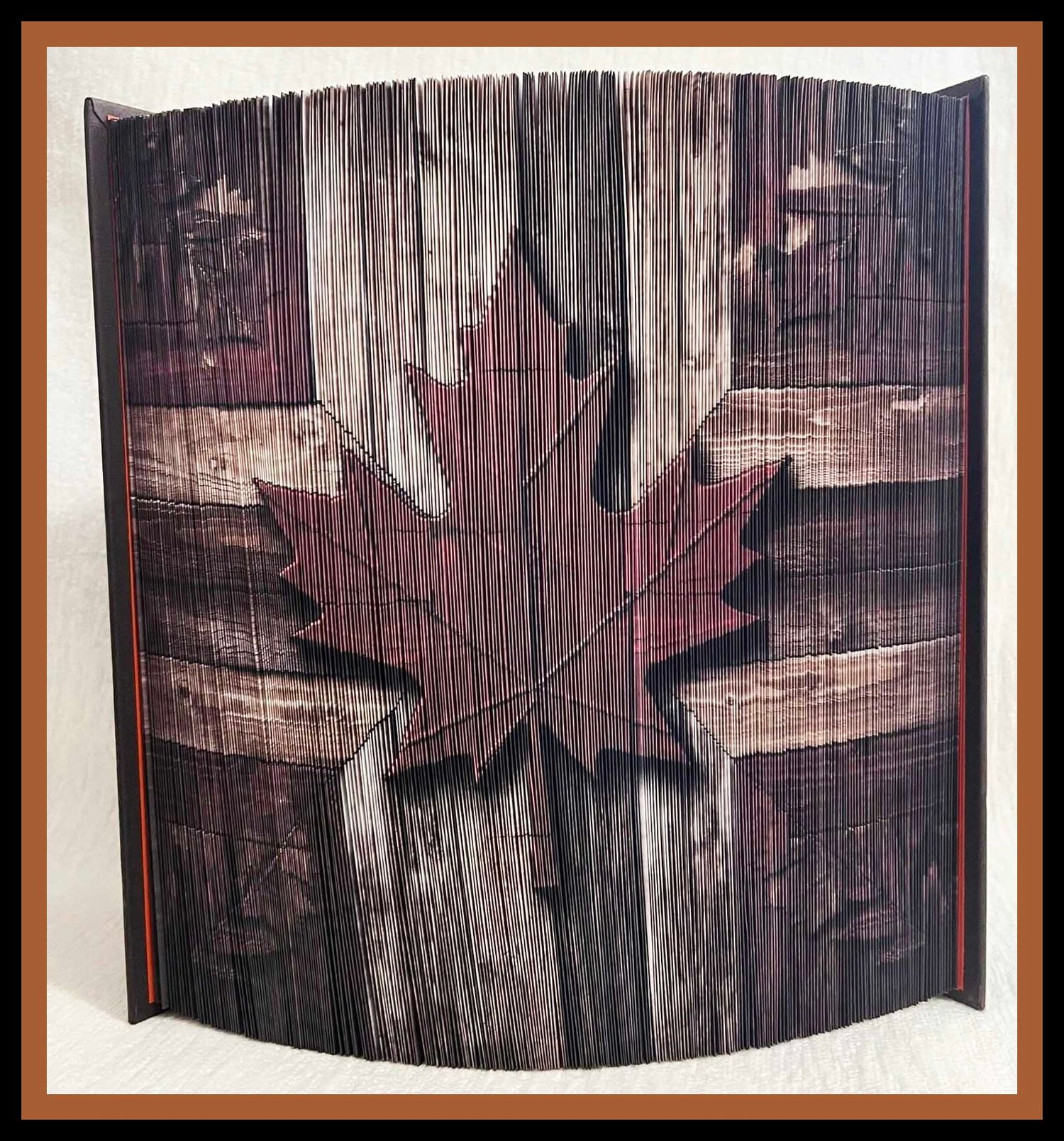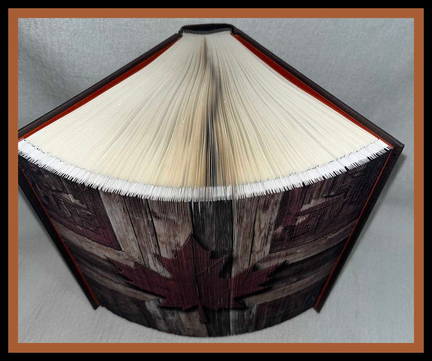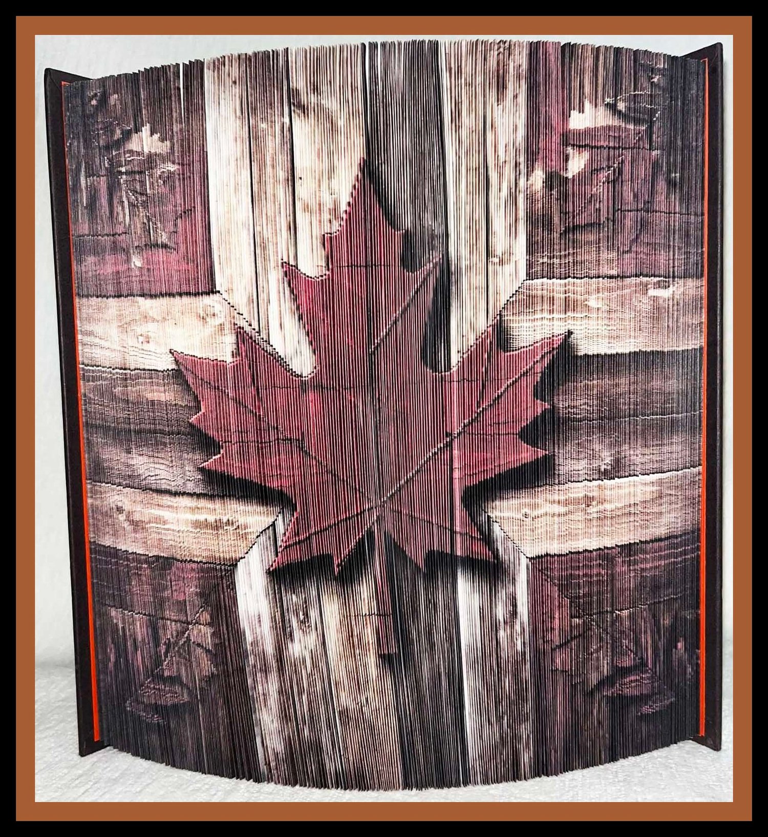 This rustic folded book art pattern features a bold Canadian maple leaf set against a beautifully textured wood plank background. The natural tones and strong central emblem create a timeless design that celebrates Canadian heritage with a warm, handcrafted feel.