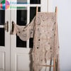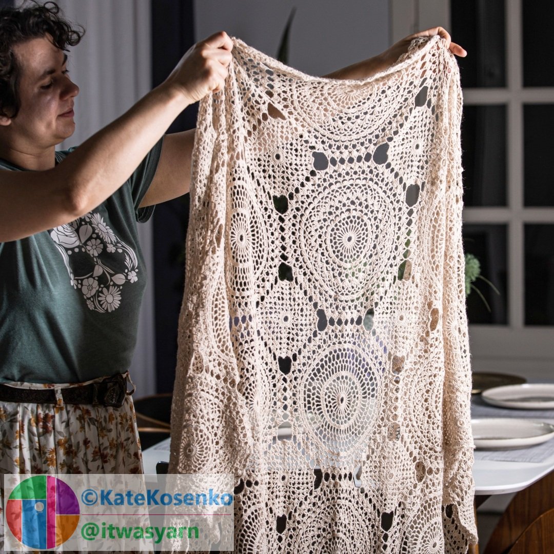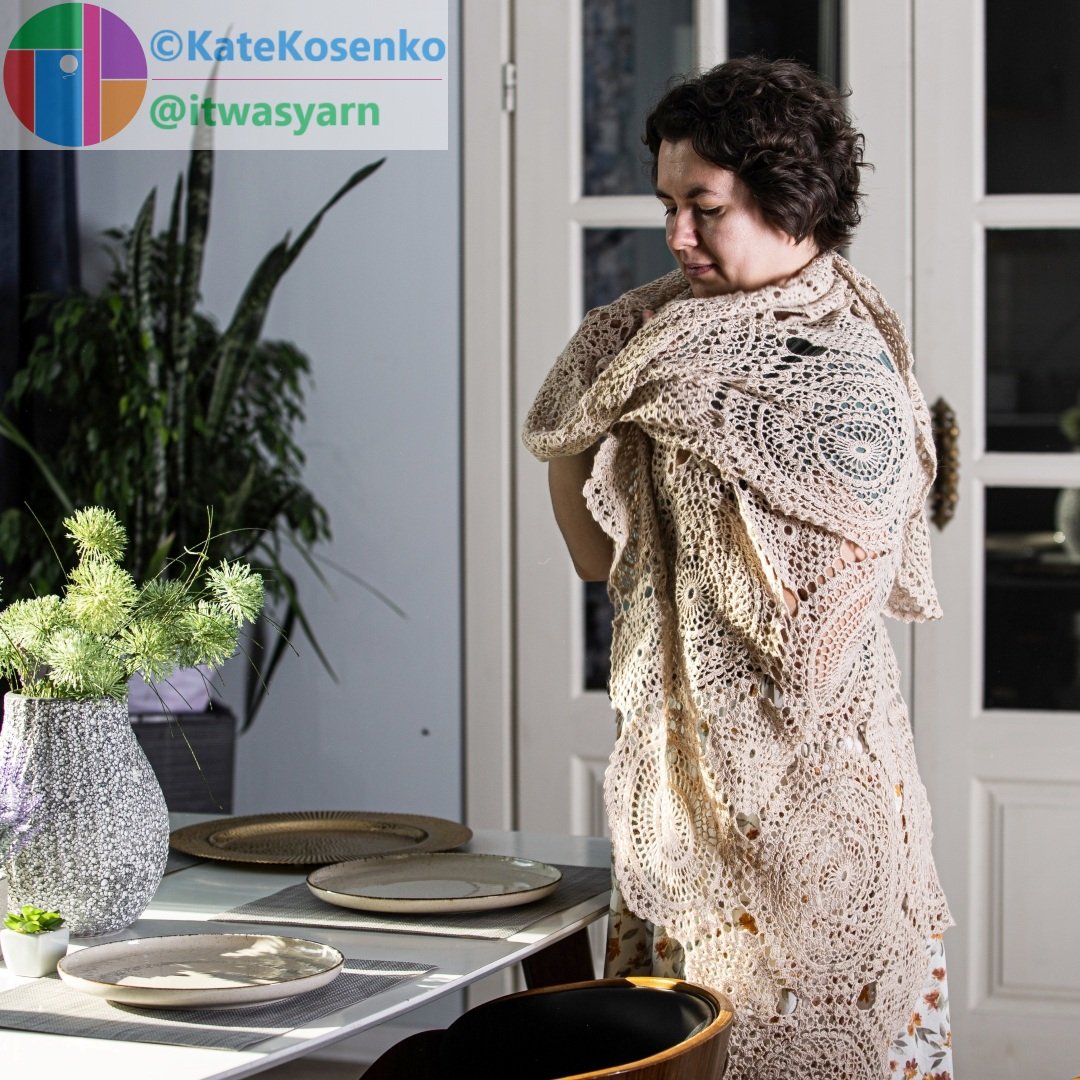 Yarn: 4 skeins of Sweetgrass Fine yarn by Purl Soho: 65% organic cotton, 35% superfine alpaca 2 ply yarn (lace weight), 3.52 oz / 100 g and 930 yd / 850 m in skein, color #9100 Pale Sesame. I used 11.44 oz / 325 g (3 + 1/4 skeins). I highly recommend this yarn! When you work with it, it’s like stroking your pet, passing the yarn through your fingers. Very warm, maintaining the effect of weightless lace!
