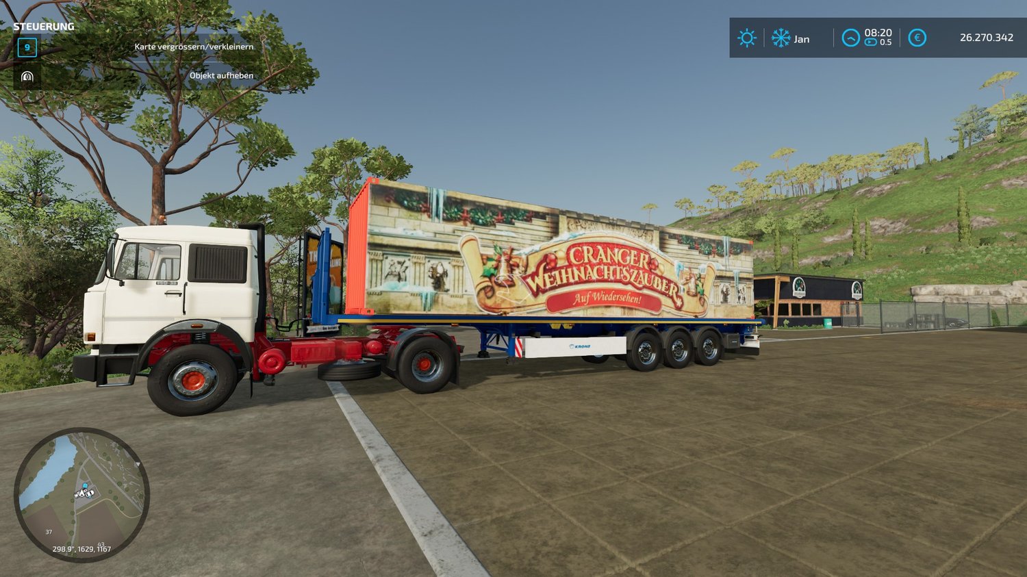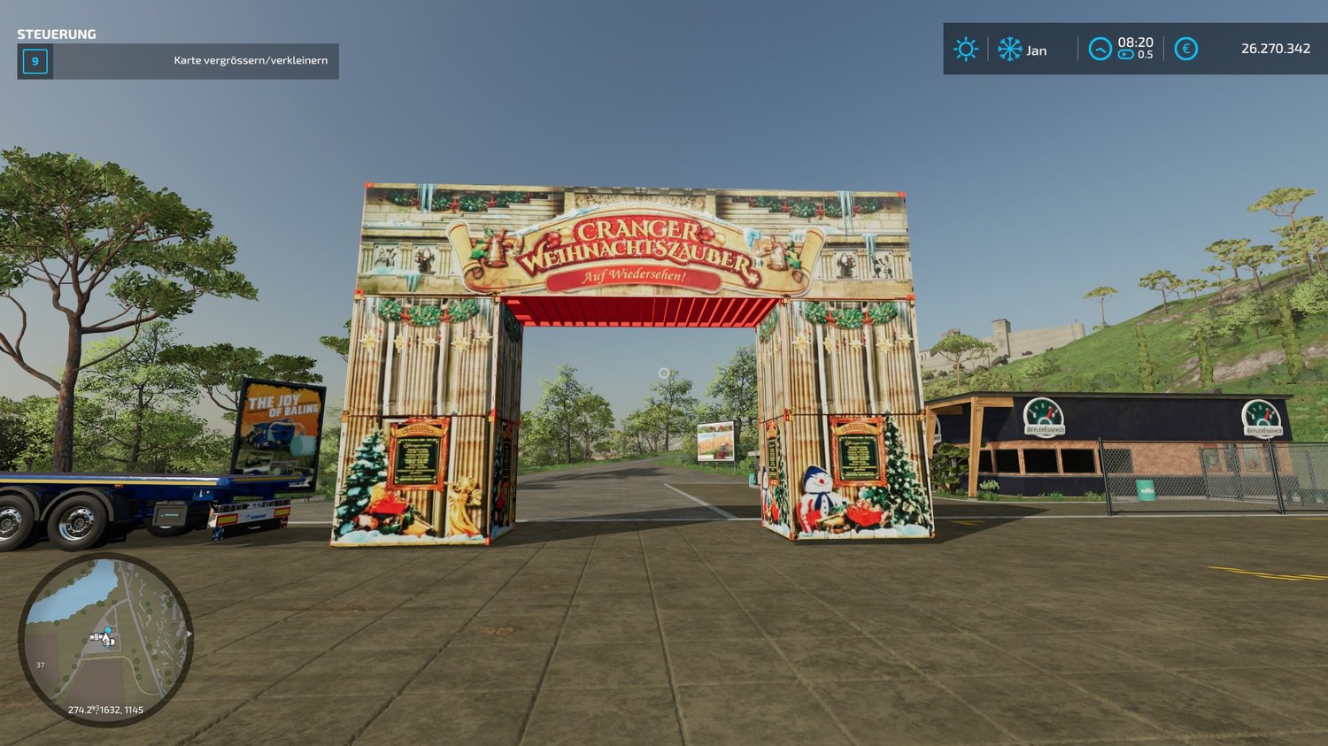 Eingangstor zum Cranger Weihnachtszauber. Es handelt sich um zwei Transportanhänger, einmal mit einem 40ft Seecontainer und einem Transport mit jeweils vier 10ft Seecontainer. Der Trailer mit dem 40ft Container beinhaltet das Tor was per SimpleIC aufgebaut werden kann.