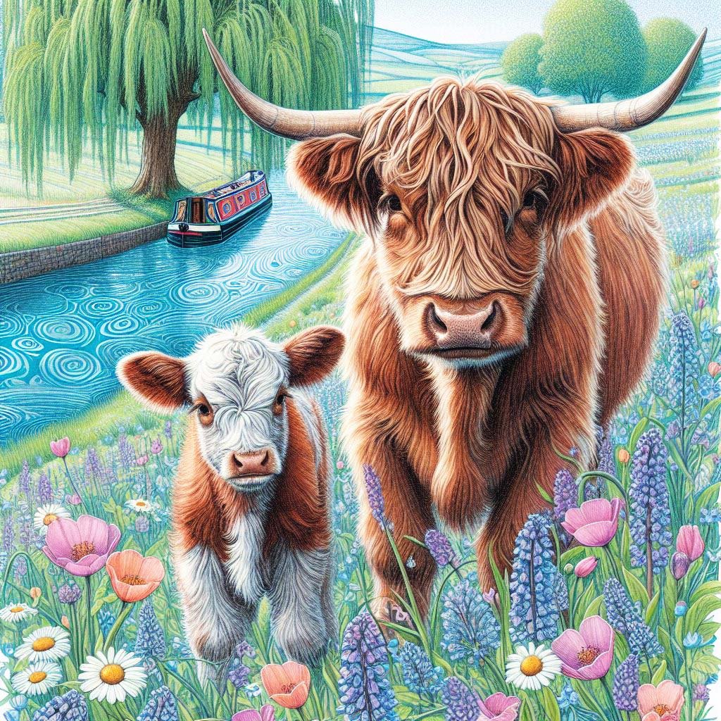 Beautiful Highland Cows beside a canal & Canal boat with bluebells & poppies. There is a weeping willow tree & blue sky.