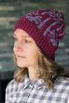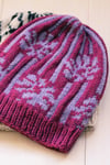 Yarn: Stonehedge Fiber Mill Shepherd’s Wool Worsted (100% merino wool; 250 yards/229m/113g). Hat shown in Stonehedge Raspberry (A) and Lilac (B); 1 skein of each color, or approximately 110 yards A and 50 yards B of worsted weight wool yarn.