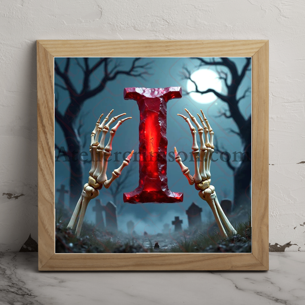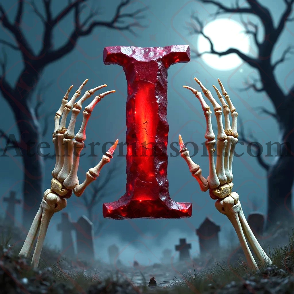 The letter I ruby halloween skull Discover our eerie alphabet series featuring photorealistic ruby letters and numbers. Each character, crafted from deep red gemstone, floats mysteriously in a misty graveyard. Skeletal hands frame these gleaming symbols against a moonlit, Halloween-inspired backdrop. Perfect for gothic design projects or seasonal decor inspiration!