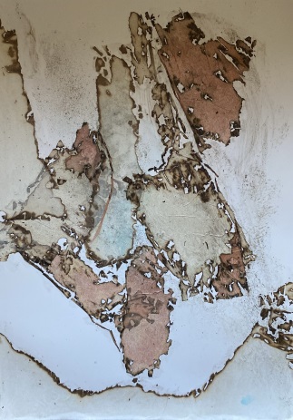 Técnica mixta sobre papel yupo (acuarela, cenizas, bolsas de té de cúrcuma quemadas, cola, pigmentos naturales y collage) Formatos: 32 x 45 cm y 49 x 60 cm.