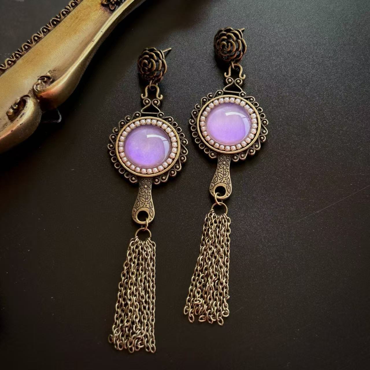Vintage French purple glass mirror tassel earrings