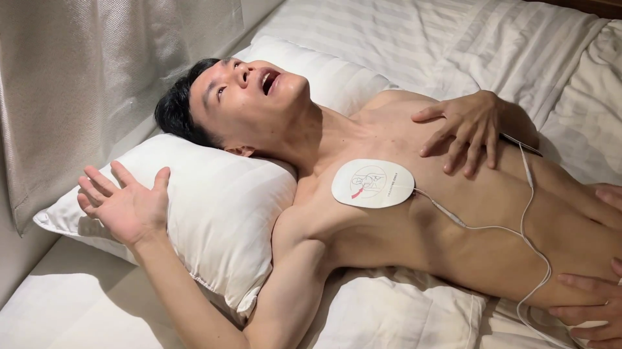 To his surprise, TíngHui agrees. They begin taking turns performing CPR on each other, the atmosphere thick with tension and adrenaline. However the playful experiment spirals out of control when TíngHui accidentally triggers the AED shock – sending a jolt through GōngLun strong enough to knock him unconscious for real. Panic floods TíngHui. Instantly, he drops into full emergency mode, launching into deep, desperate CPR compressions and cycling the AED again and again. Each shock echoes with fear, urgency, and determination as he fights to pull GōngLun back from the edge. This time, the test is no longer academic, it’s a race to bring his friend back to life.