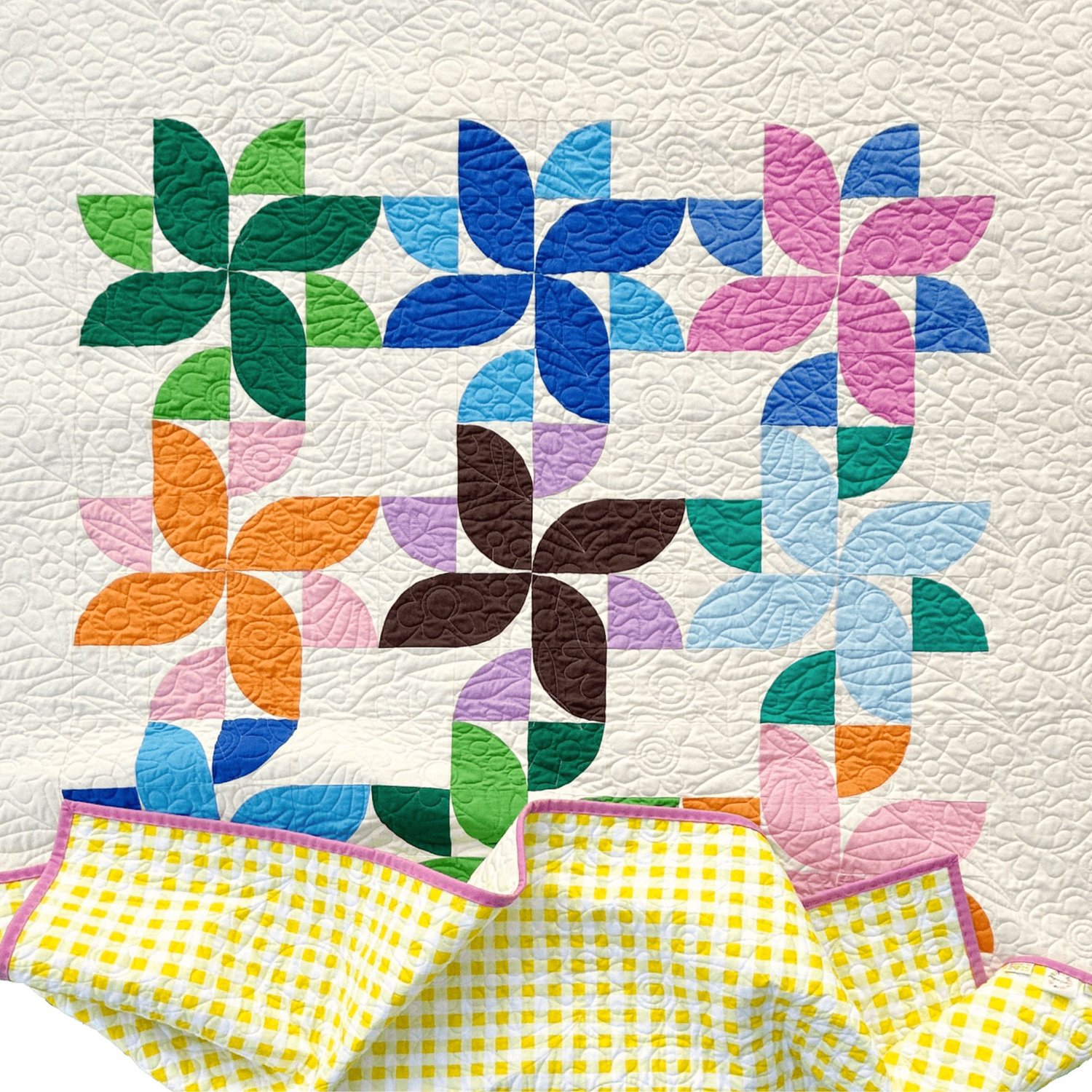 Bloom Ballet is a fat quarter–friendly curved piecing design featuring flowers that spin and dance across the quilt top. Mix and match flower centers and petals to suit your style, with a wide border of negative space that lets the blooms shine.