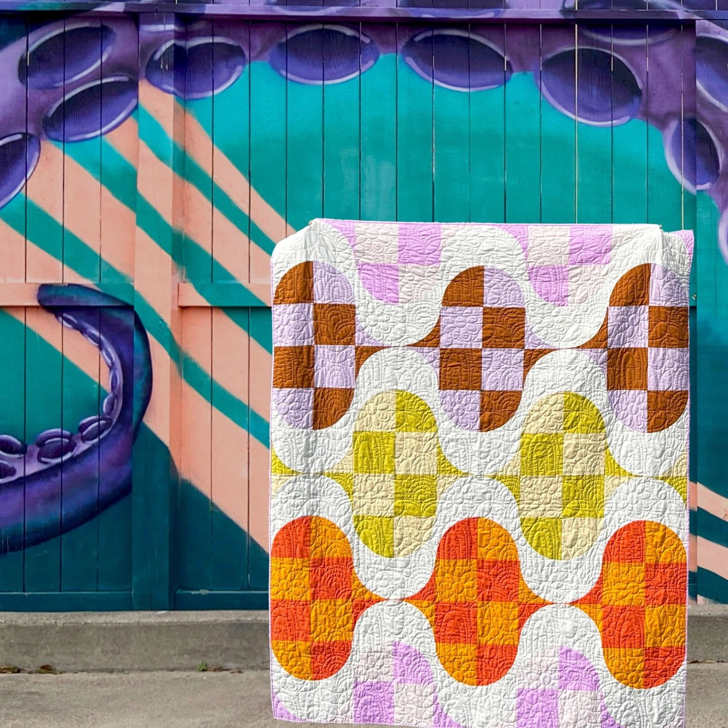This PDF bundle pairs Bloom Ballet and Make Waves, two modern quilt patterns built around curved piecing and motion. One dances with spinning flowers, the other flows with rhythmic waves—together they make a playful, satisfying duo for quilters who love curves and bold design.