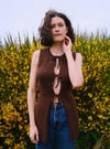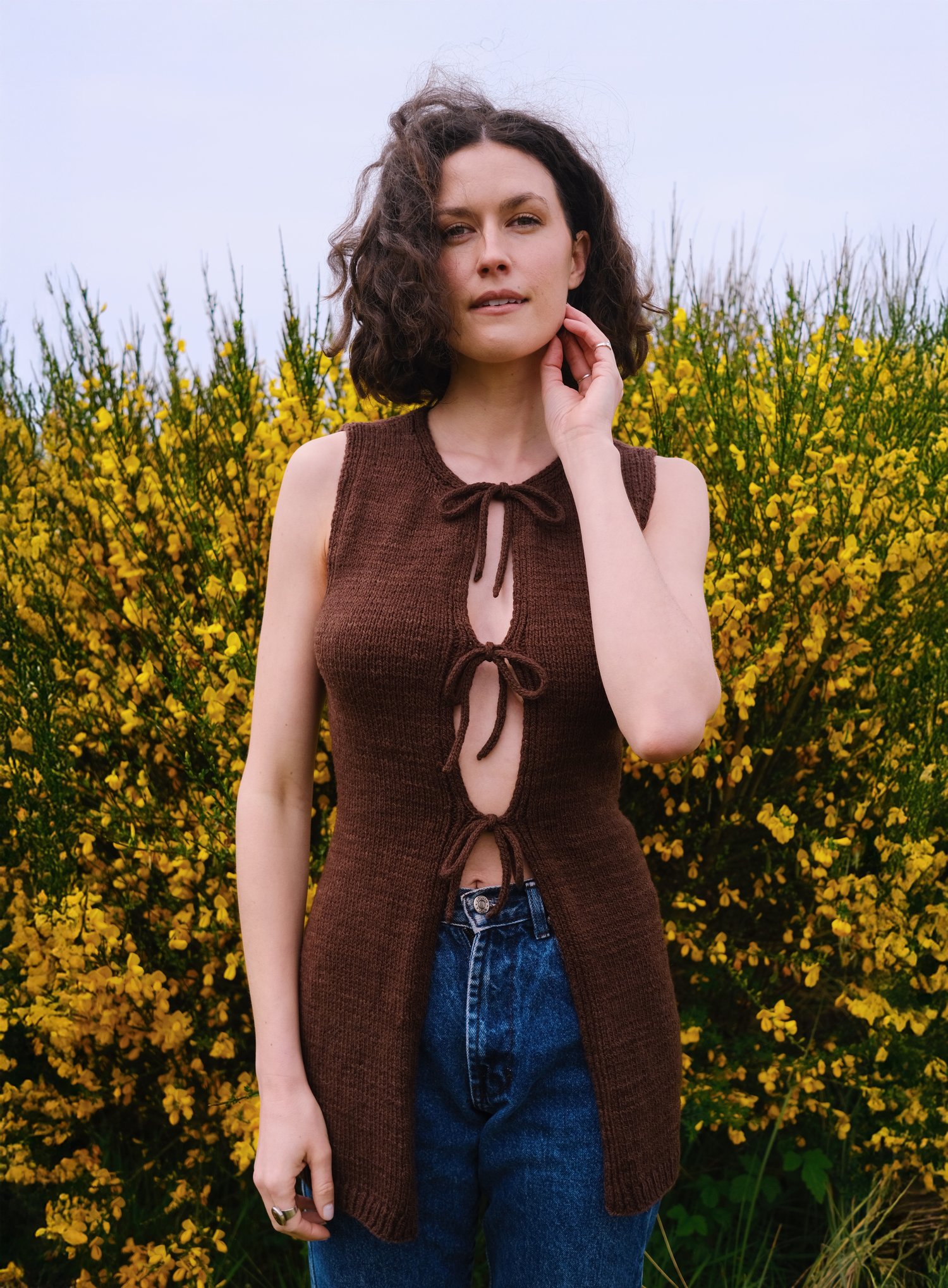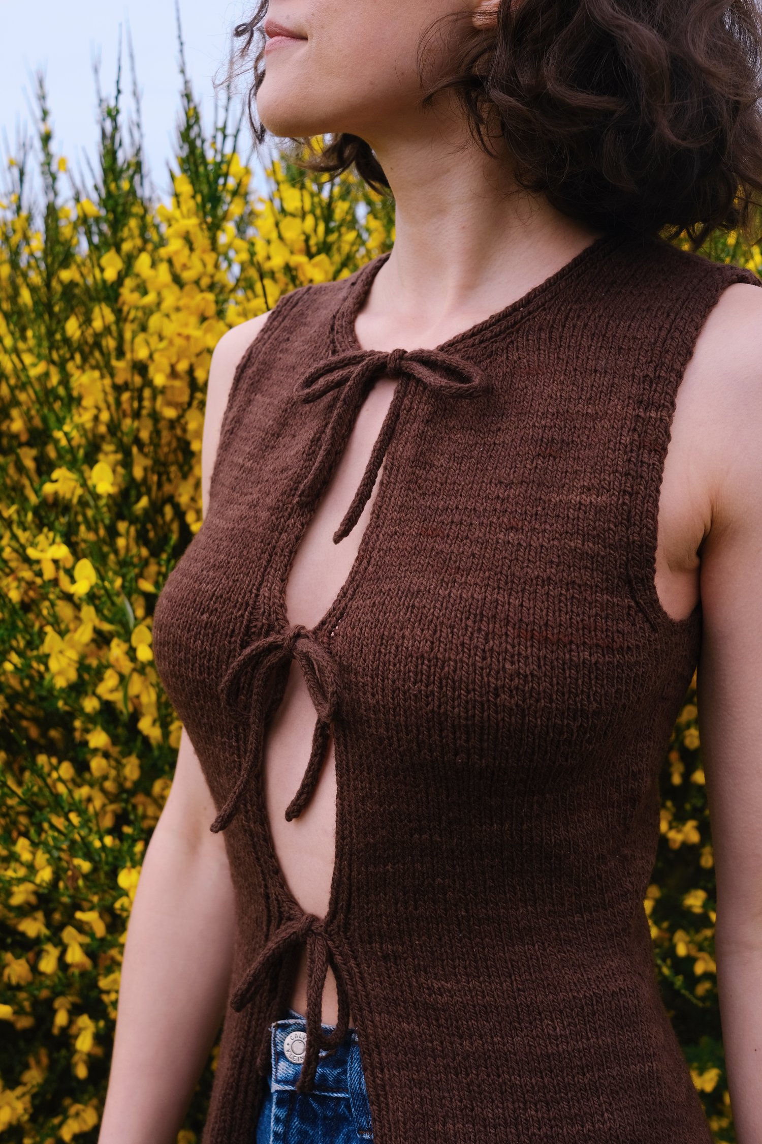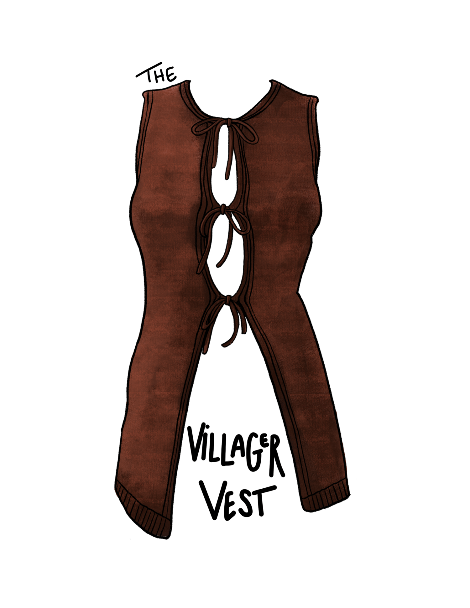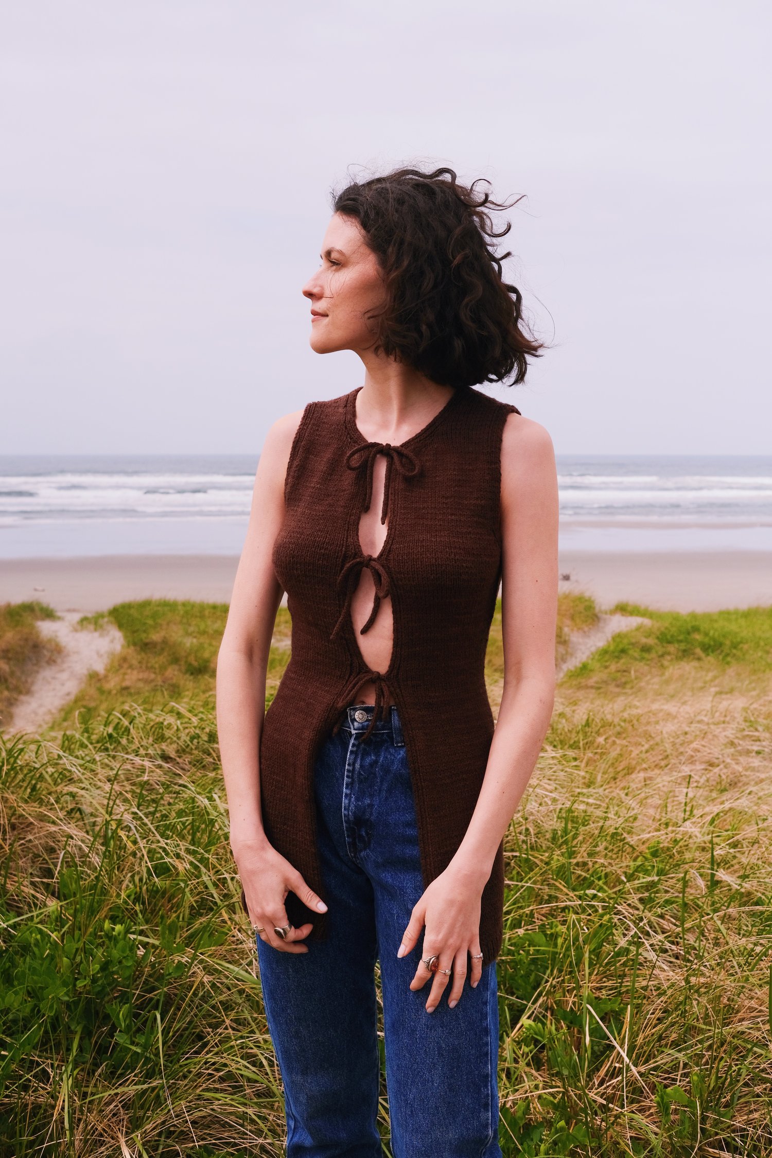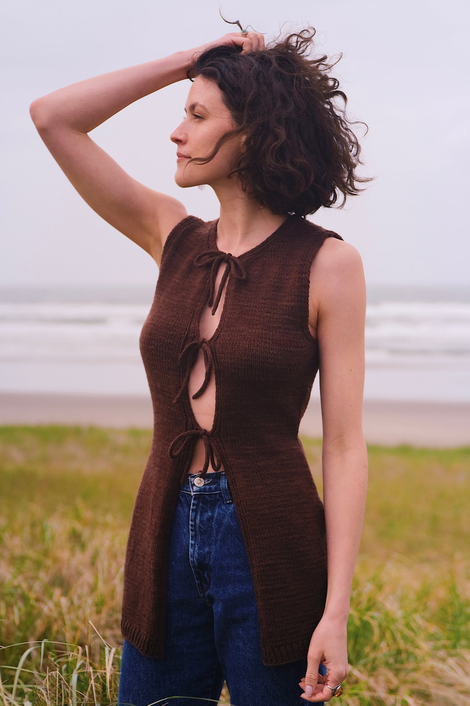 A long vest/tunic hybrid with bow tie closures for your cozy quotidian life or your grand voyages out of the village. Knit from the top down with optional waist and hip shaping, the Village Vest is meant to be worn as either a standalone top or as an additional warm layer!