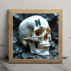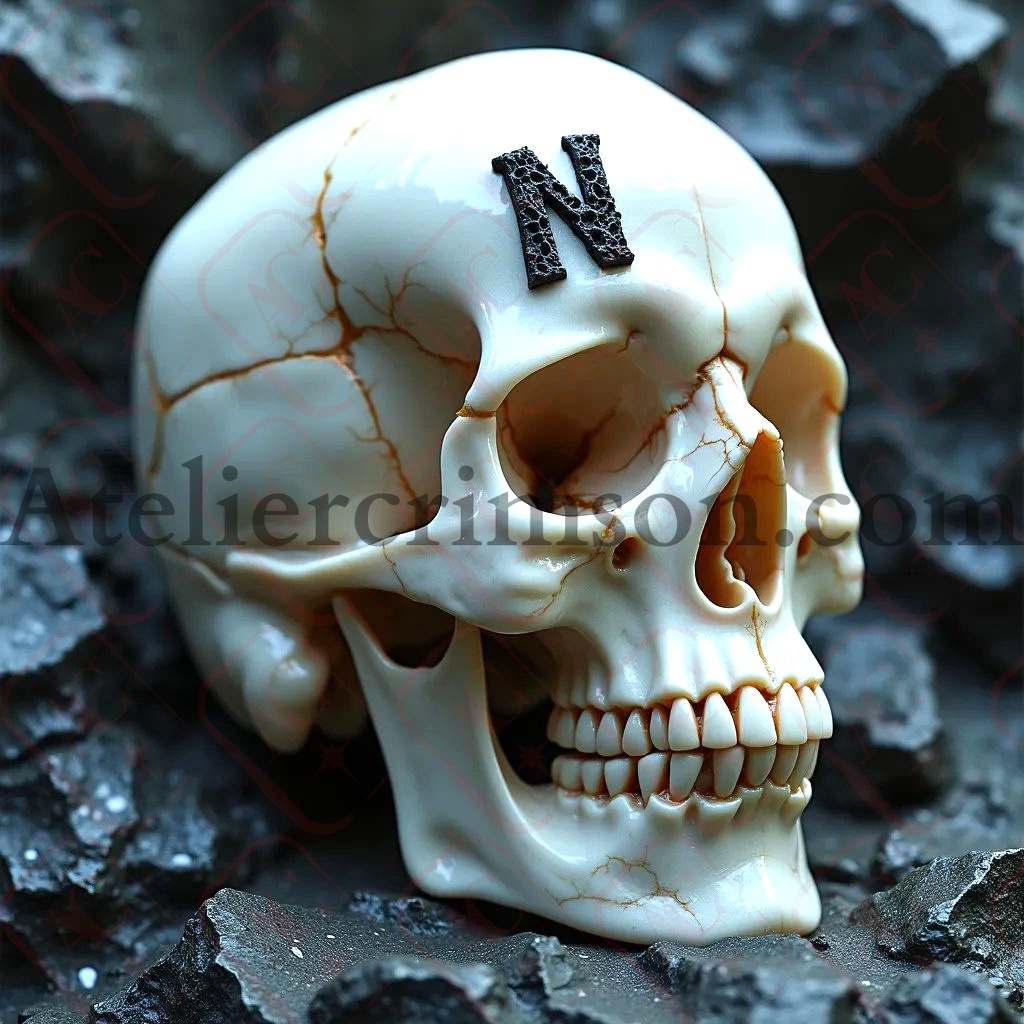 The letter N skull obsidian marble deeply engraved character on the forehead of a white marble skull. The character, filled with dark obsidian, contrasts sharply against the pale skull. Set against a black crystalline background, the skull and character dominate the image.