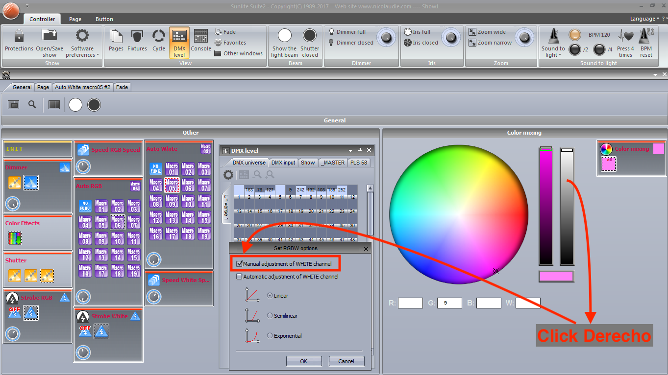 * En el modo CH11 verifique, con una Librería de pruebas (click), que coincidan estos canales: 1 Dimmer, 7 Azul, 2 Strobo.