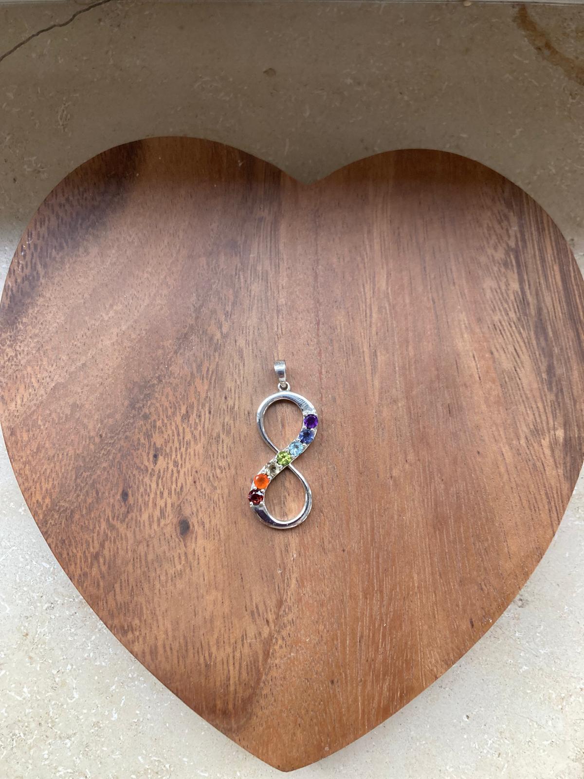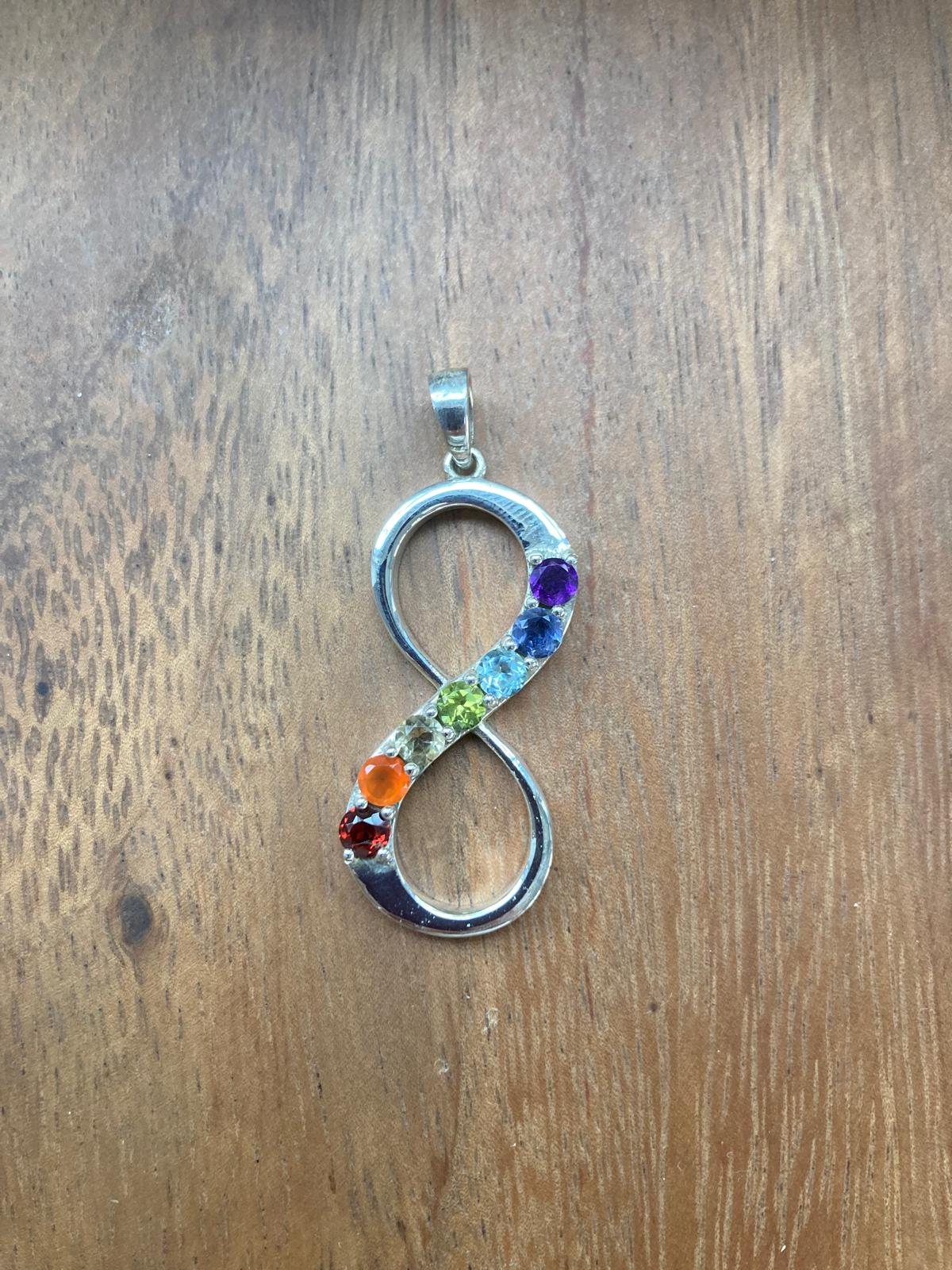 Größe ca. 4 cm, 925er Sterling Silber, Lemniskate mit Chakrasteinchen aus Amethyst, Iolith, Blauer Topaz, Peridot, Citrin, Karneol, Granat