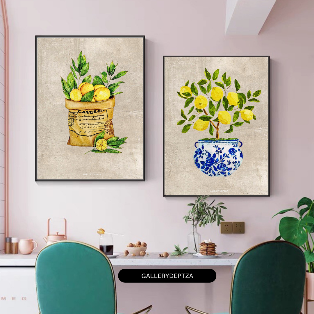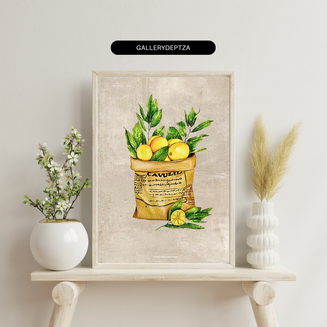 Bring a touch of rustic freshness to your kitchen or dining space with this lemon-themed wall art bundle. The set includes two beautifully coordinated prints — one featuring a lemon tree in an antique vase, and the other showcasing lemons in a brown paper bag on a soft, neutral textured background.