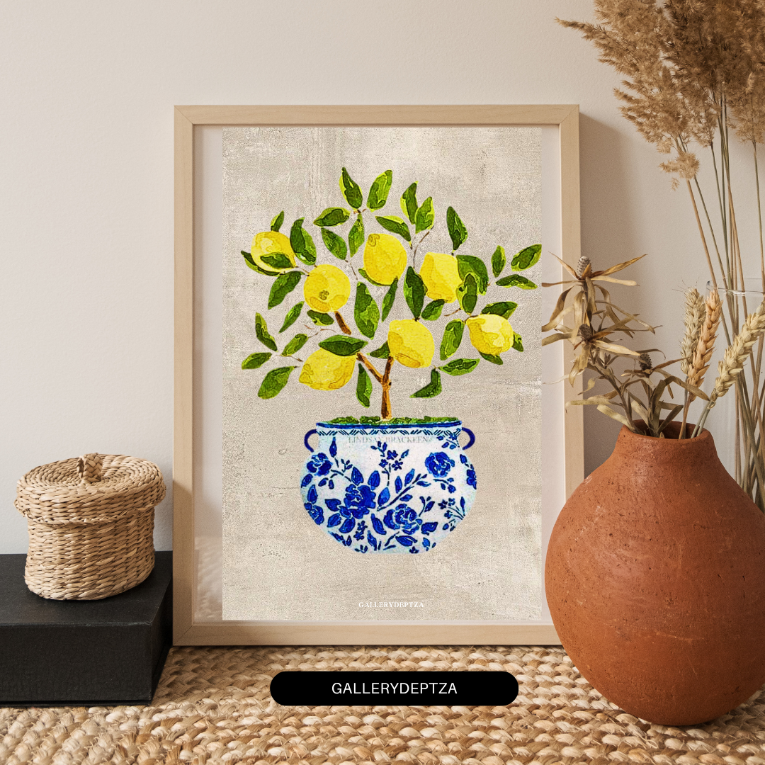Lemon Tree & Lemons Kitchen Wall Art – Neutral Aesthetic Digital Download | A4 & A3 PDF Bundle of 2