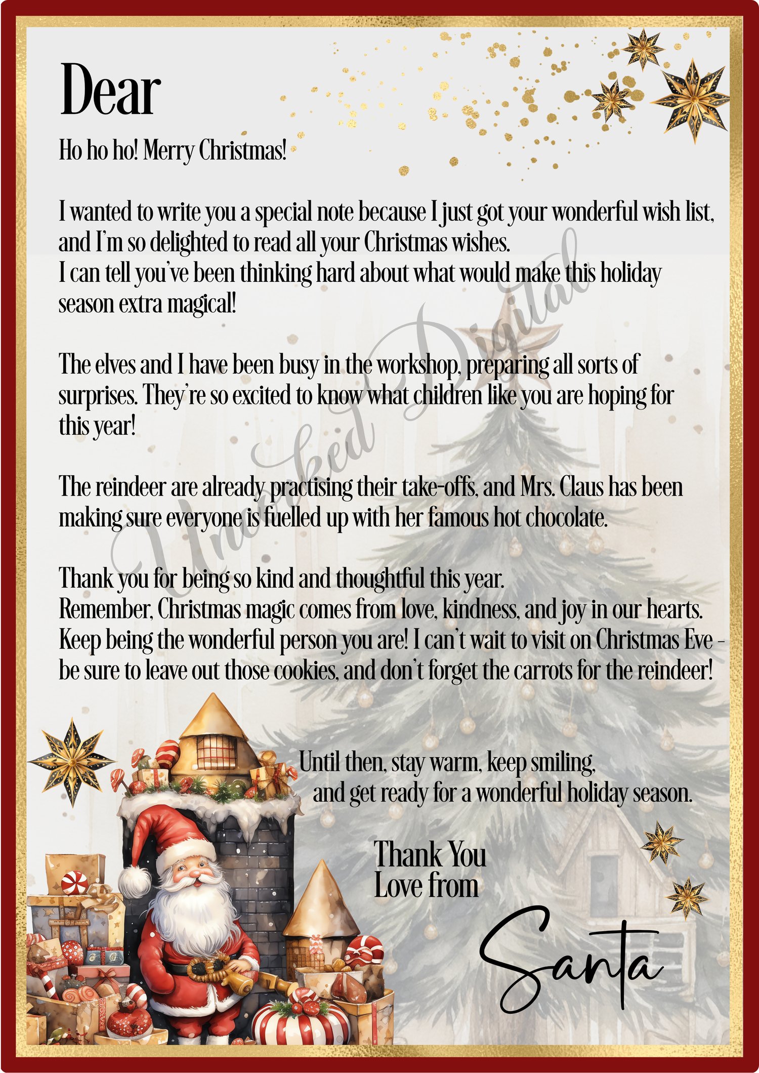 Letter to and from Santa, ready to be filled with the childs details, sized at A4 but can be resized.