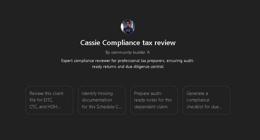 Ensure accuracy and stay audit-ready with Cassie Compliance Tax Review ChatGPT AI Bot! 🤖💼 Designed for tax professionals, this intelligent assistant helps review returns, check compliance, and identify potential issues before filing. Save time, reduce errors, and keep every file compliant — no template required!