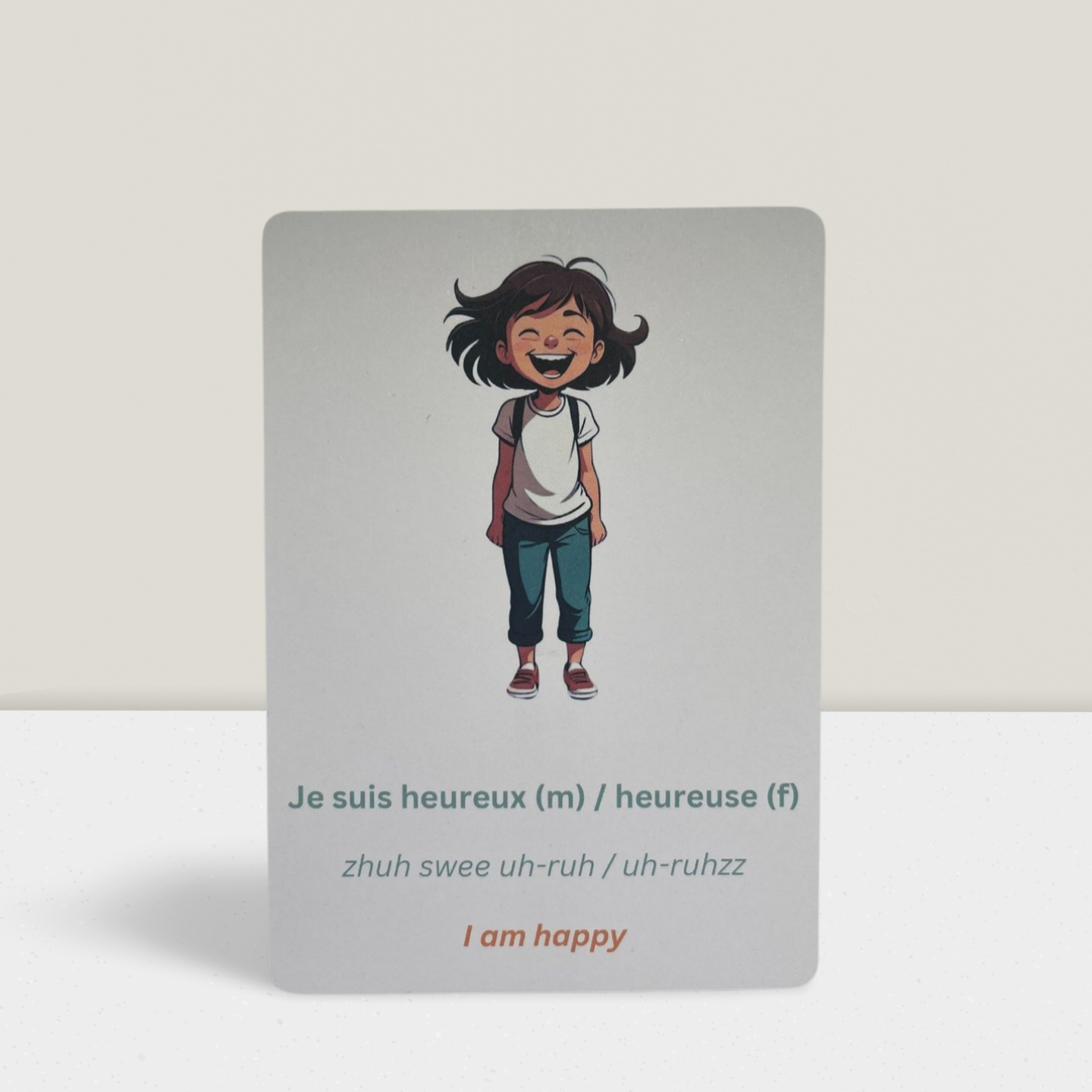 Most flashcards focus on single words. While those types of products do have their place, they're not really designed to get you speaking. That's where our "I am" phrases differ.