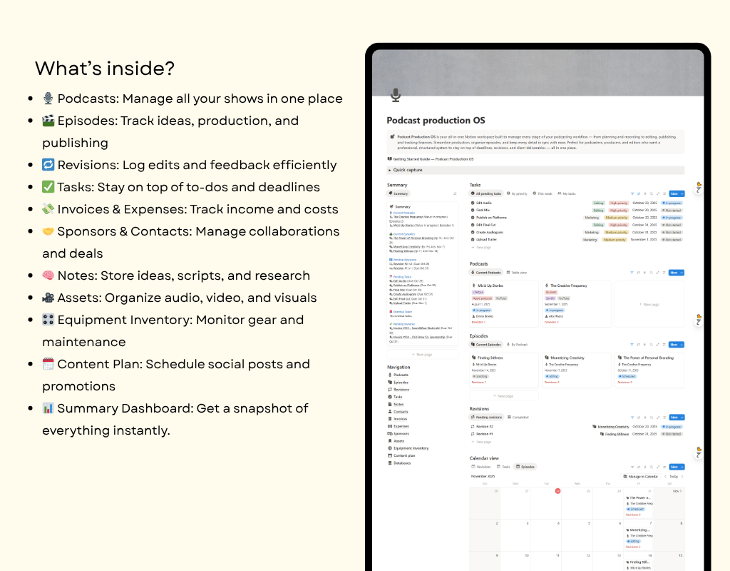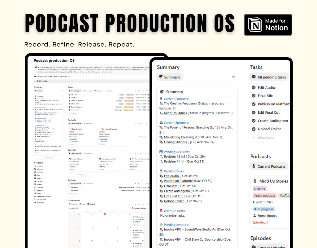 The Podcast Production OS is your all-in-one Notion system designed to streamline every stage of your podcast journey—from ideation to publication and beyond. It helps creators, producers, and teams stay organized, manage production efficiently, and keep every detail in one connected workspace.