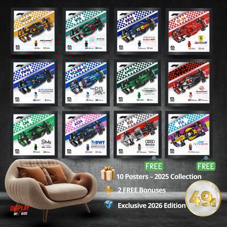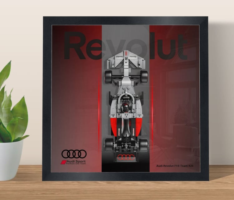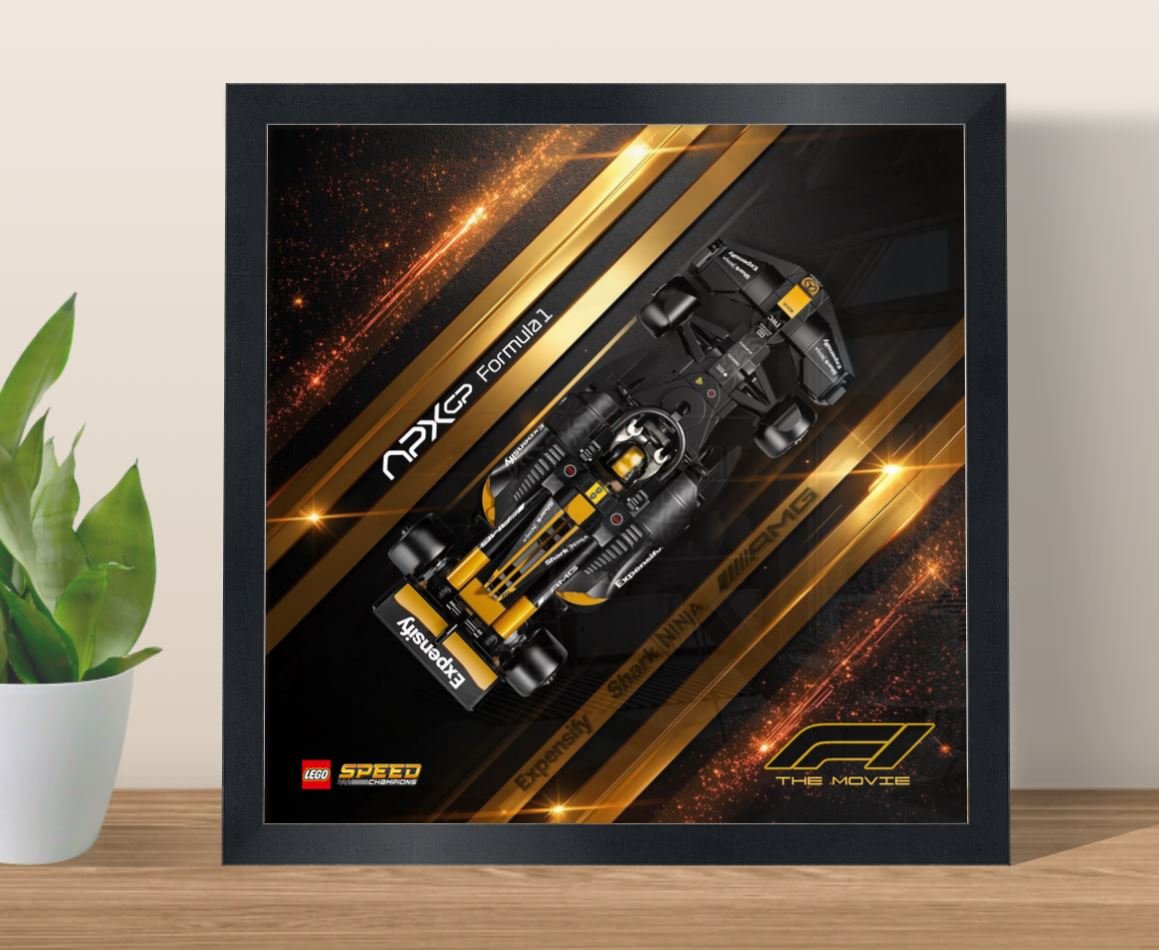 This APXGP F1 framed poster (25×25 cm) – Model 3 is a graphic and minimalist alternative design, created to complement the LEGO® Speed Champions APXGP Formula 1 car (#77252) inspired by F1® The Movie.
