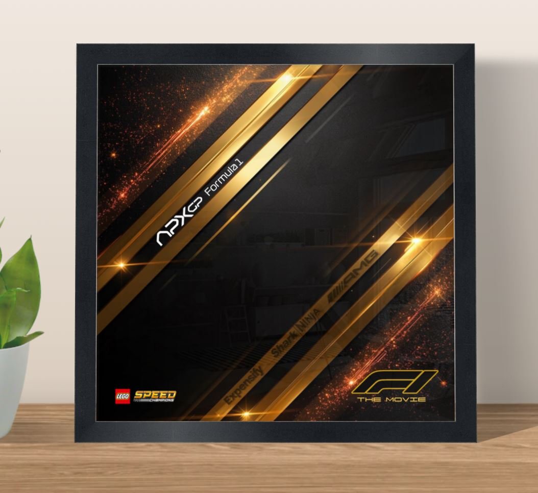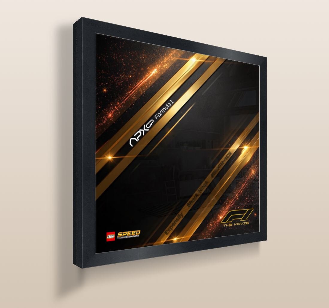 Unlike Models 1 and 2, Model 3 focuses purely on atmosphere and branding: black and gold racing lines, dynamic light streaks, and APXGP / F1 The Movie visual elements. The absence of the car creates a clean, elegant background that works perfectly inside a frame, either on its own or paired with the LEGO model displayed separately.
