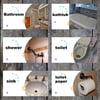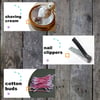 bathtub, shower, toilet, sink, toilet paper, toothbrush, electric toothbrush, toothpaste, shampoo, soap, comb, hairbrush, hairdryer, towel, mat, razor, electric razor, shaving cream, nail clippers, and cotton buds.
