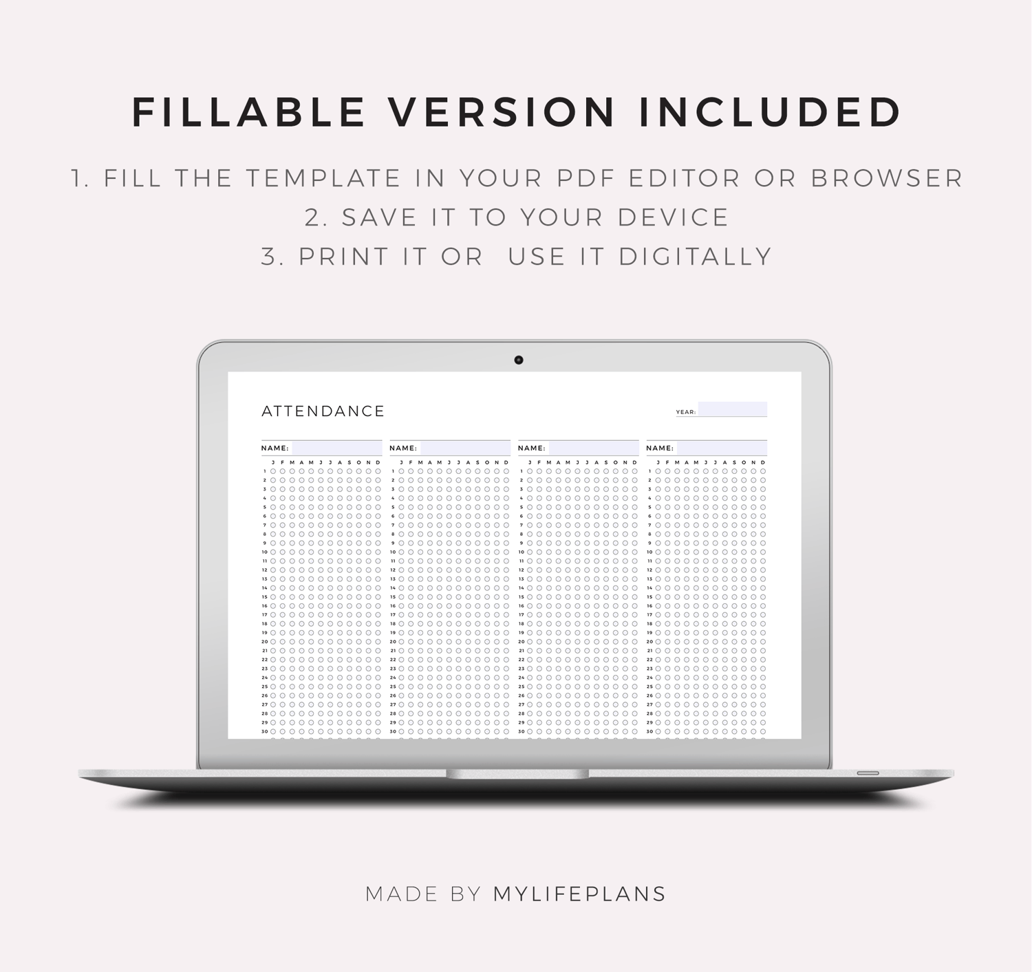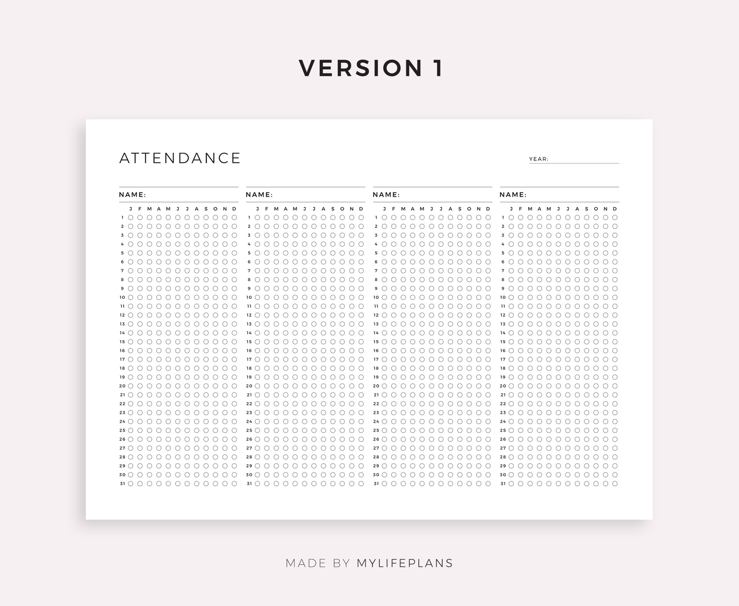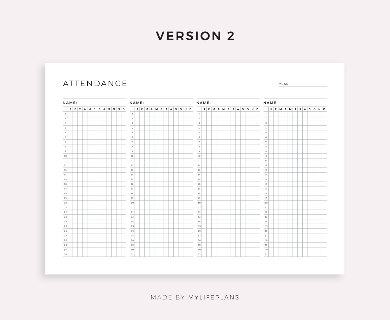 This is a printable yearly attendance log — just download, print, and start using it right away.