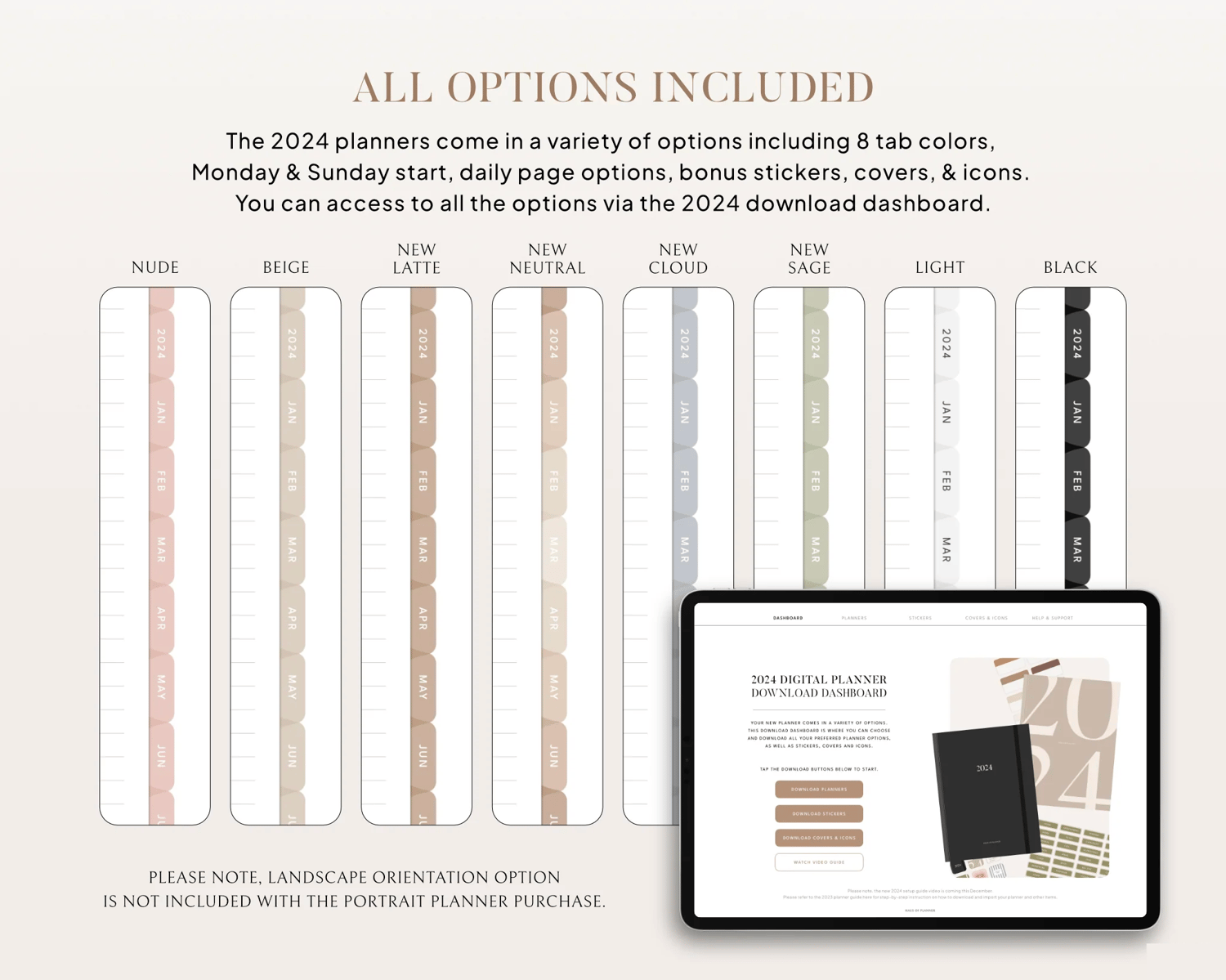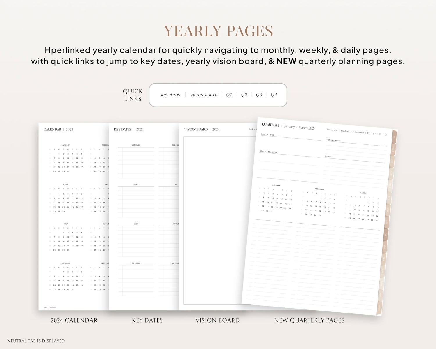 New customization options and many features have been added to the 2024 planners including 8 neutral tab colors, 2 daily layouts & no daily options, new quarterly pages, new weekly & monthly quick links, 12 customizable sections with more papers & life planning templates. Monday & Sunday start included.