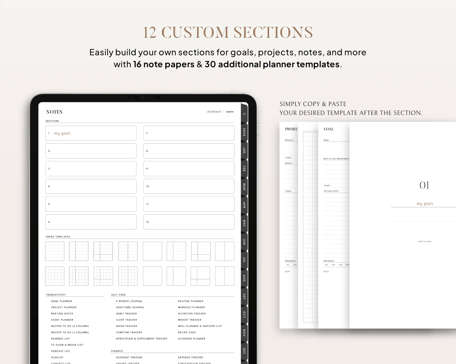 - NEW Notes page with hyperlinks to 12 custom sections, papers, & planning templates