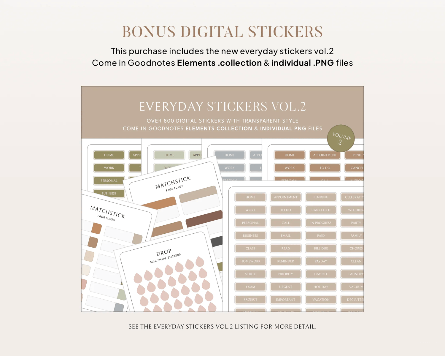 - 800+ Everyday Stickers Vol.2 including 8 new colors: chocolate, cloud, cream, latte, nude, olive, sage, & stone. Come in Goodnotes Elements .collection & Individual .PNG files