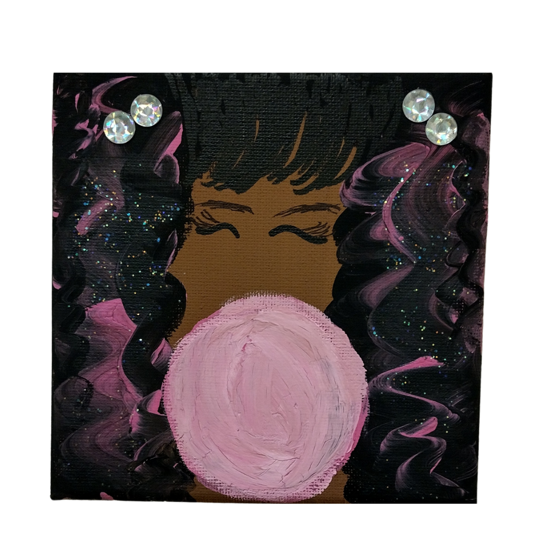Girl with pink hair blowing bubble gum. On many 5x5 canvas. Perfect for shelf decoration and also a fridge magnet!