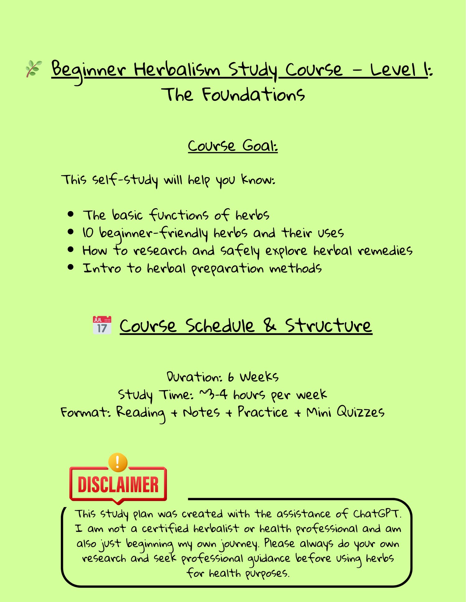 Disclaimer: This study plan was created with the assistance of ChatGPT and is intended as a beginner-friendly guide to support personal learning. While every effort has been made to provide accurate and useful information, I am not a certified herbalist, health practitioner, or medical professional. I am also at the beginning of my own herbalism journey and sharing this as a structured way for others to explore alongside me.