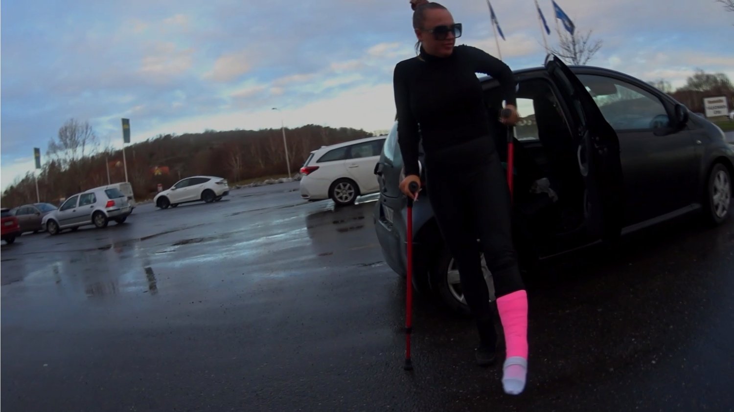 Polki is wrapped up in a pink SLC on her left leg but still wouldn’t stay home to rest, it’s a wet and rainy day outside when she decided to swing by the store to look for some things. She crutches through the narrow aisles and has to be very careful so that she wouldn’t bump into stuff. Her casted leg is always in the focus from behind as we follow her closely to get such a wide and clear view. After following her through the entire store, Polki crutches back out to the car again where her friend is waiting inside, there’s barely any space between her car and the car beside, now she has to squeeze into the back seat with her crutches and the clumsy casted leg.