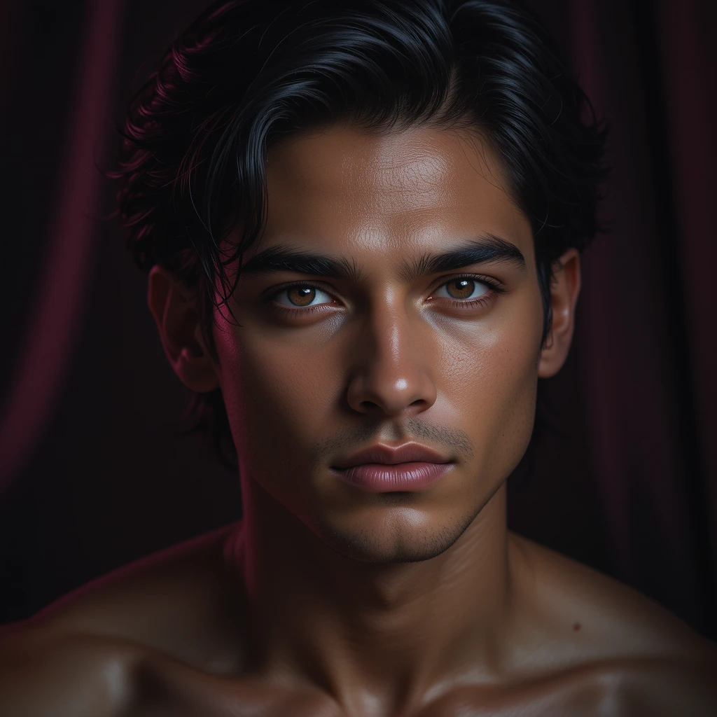 Velvet Gaze is a luxurious, high-resolution digital artwork created by Æther天神. This captivating portrait features a golden-olive skinned male with deep brown eyes and soft black hair. Set against moody shadows and warm plum tones, his expression speaks in silence — alluring, still, and full of depth.