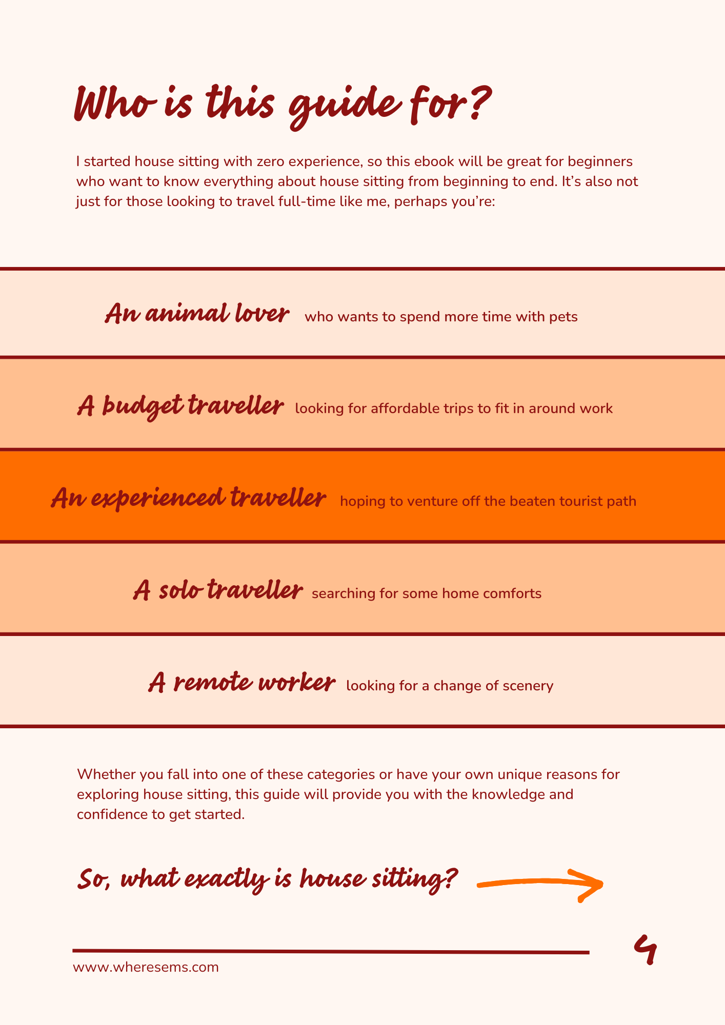 Whether you’re looking to dip your toes in with weekend sits or dive into full-time house sitting as I have, my 35-page ebook is packed with all the knowledge you need to become a house sitter.