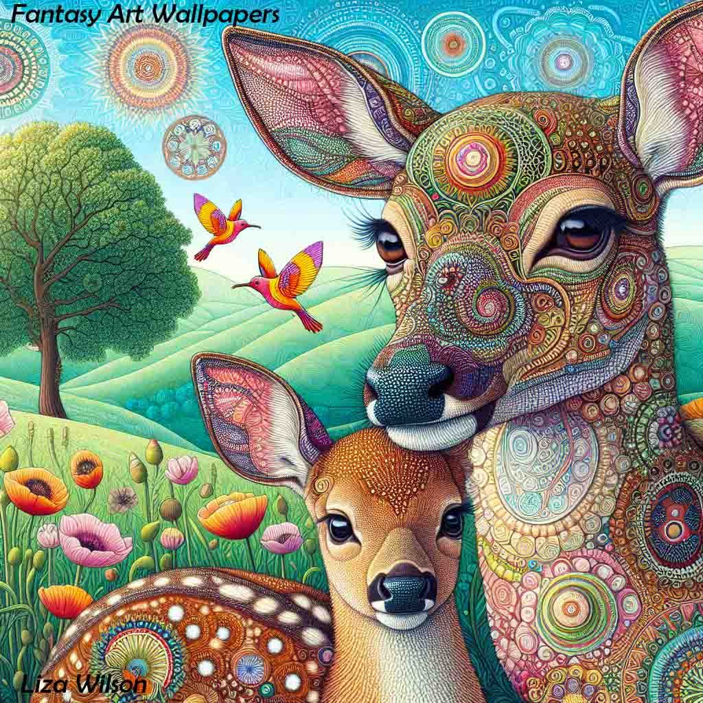 Deer & fawn with spirograph patterns on hills with a patterned colourful tree, poppies, & humming birds. Spirograph style.
