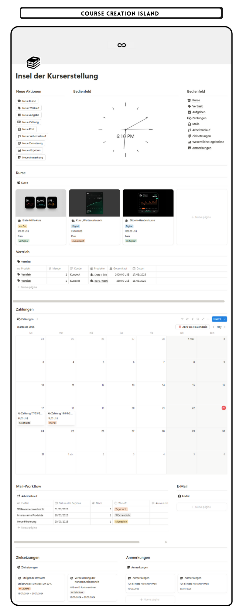 Wenn du Kurse verkaufst oder Bildungsk content erstellst, weißt du, dass Organisation der Schlüssel zum Erfolg ist. Kurs-Erstellungsinsel hilft dir, jede Phase des Lehrprozesses zu planen, zu strukturieren und zu verwalten – von den Inhalten bis hin zu den Verkäufen.