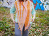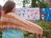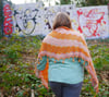 Elpénor est un châle excentrique et coloré, basé sur un jeu de rayures à chevrons et de point mousse. Une forme demi cercle, des chevrons et des jetés, des rangs raccourcis à fortes doses des couleurs soigneusement choisies pour marquer les esprits, une petite série de pampilles multicolores avec ce qu’il reste de fils pour la touche d’excentricité et voilà un châle avec beaucoup de caractère.