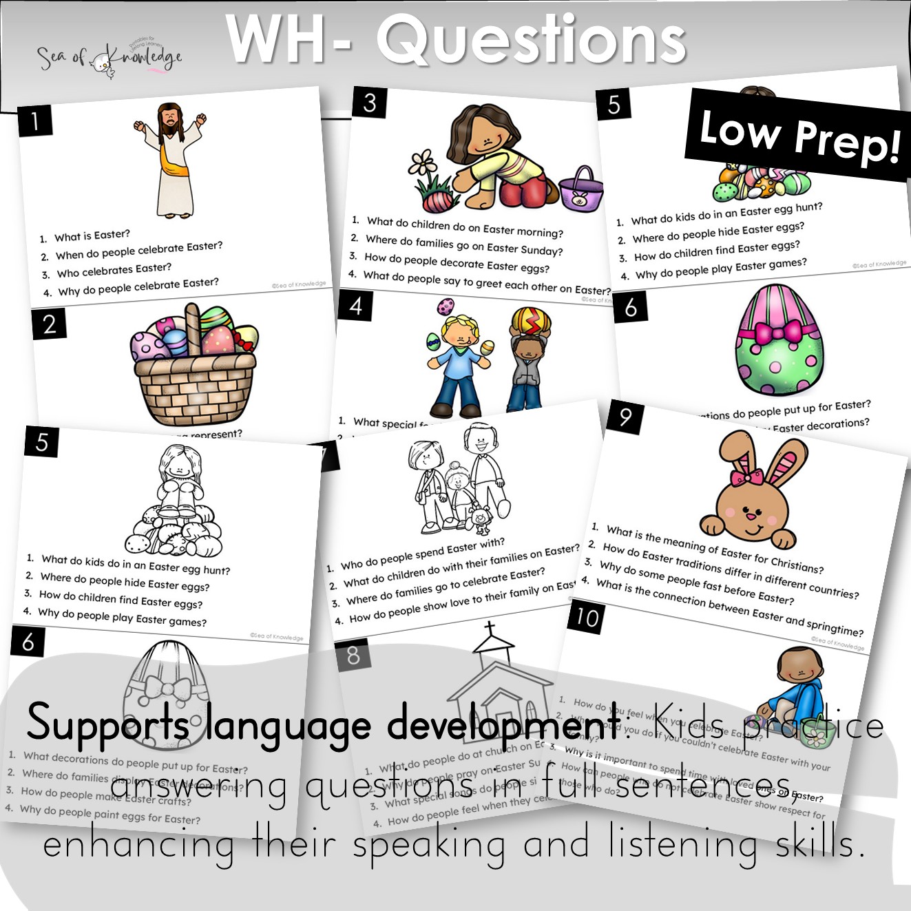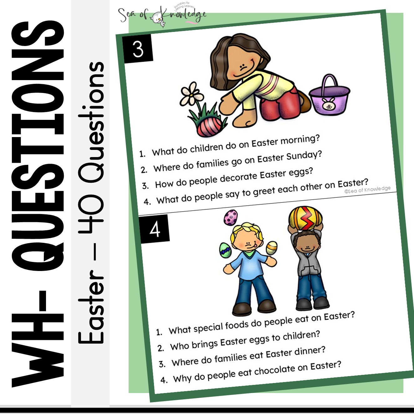 The set includes a variety of WH questions such as “What is Easter?” “Where do people go on Easter?” “Why do people celebrate Easter?” and many more. The last two cards are slightly more challenging, helping to encourage higher-level thinking for students ready for a little extra challenge.