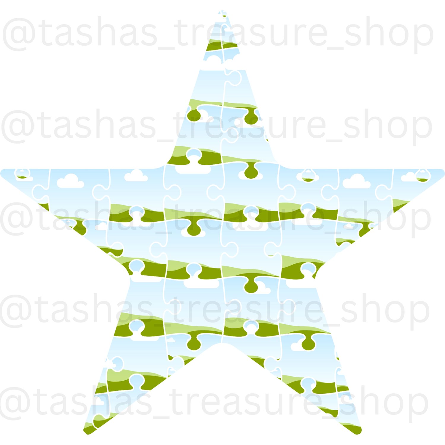 Create something truly unique with this beautiful star-shaped puzzle template! Featuring a soft sky-blue background with playful clouds and flowing green landscape details, this eye-catching design is perfect for personalized gifts, keepsakes, and creative projects.