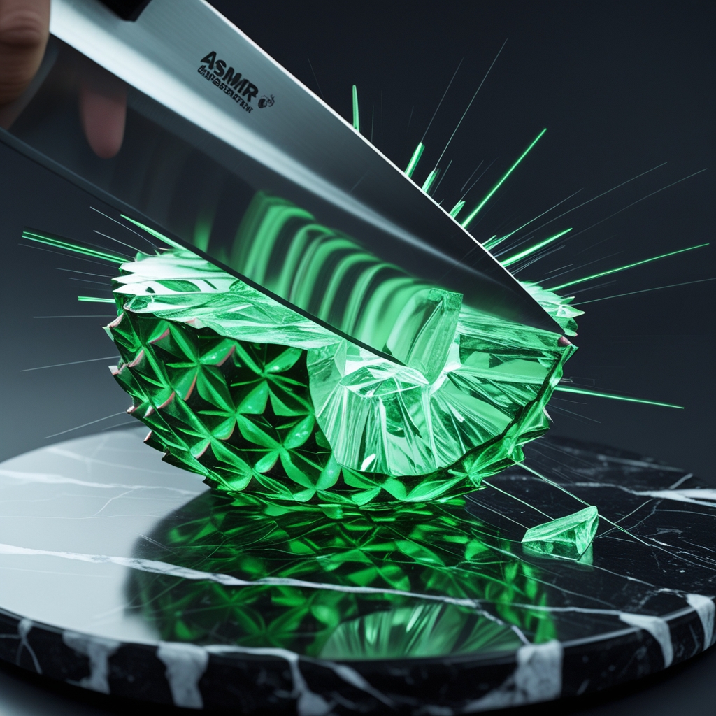 Realistic 4K footage close-up of a knife rapidly cutting a neon green crystal pineapple on a black marble slab. The blade cuts through the whole fruit from top to bottom, breaking it into radiant, glowing slices. The inside of the fruit is also crystal. The sound is ASMR style.