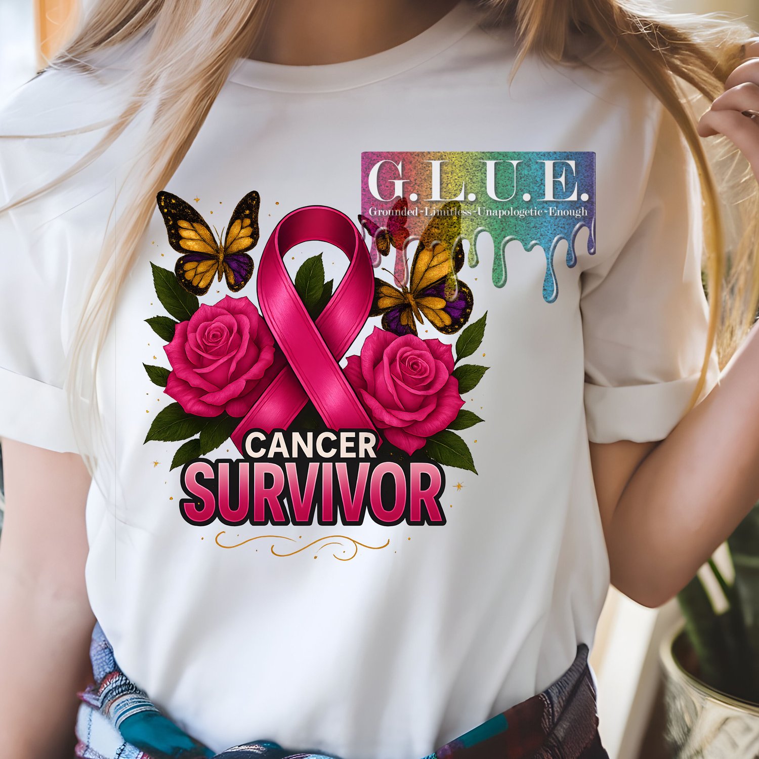 This high-resolution image features a glossy pink awareness ribbon surrounded by roses and shimmering gold-and-purple butterflies, symbolizing rebirth, transformation, and victory. Whether you’ve conquered cancer yourself or want to honor a survivor, this design reminds you that self-work, healing, and getting the bag go hand in hand.