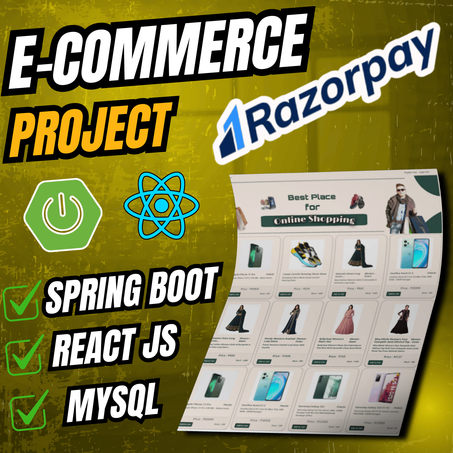 Build a complete full-stack E-commerce Shopping System Project Source Code using Java Spring Boot (backend), React JS (frontend), and MySQL (database) with Razorpay Payment Gateway Integration and Email OTP Verification for registration, password recovery, and order confirmation for your final year, internship, or capstone project.