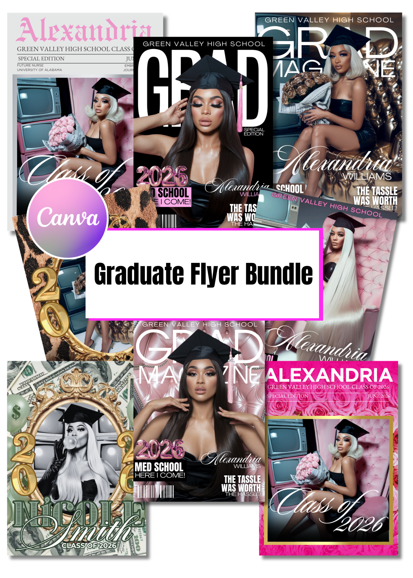 Celebrate graduation in style with this 8 piece magazine style graduation flyer template bundle! Designed with a modern, editorial layout, these flyers are perfect for showcasing graduates in a bold, high end way just like a magazine cover.