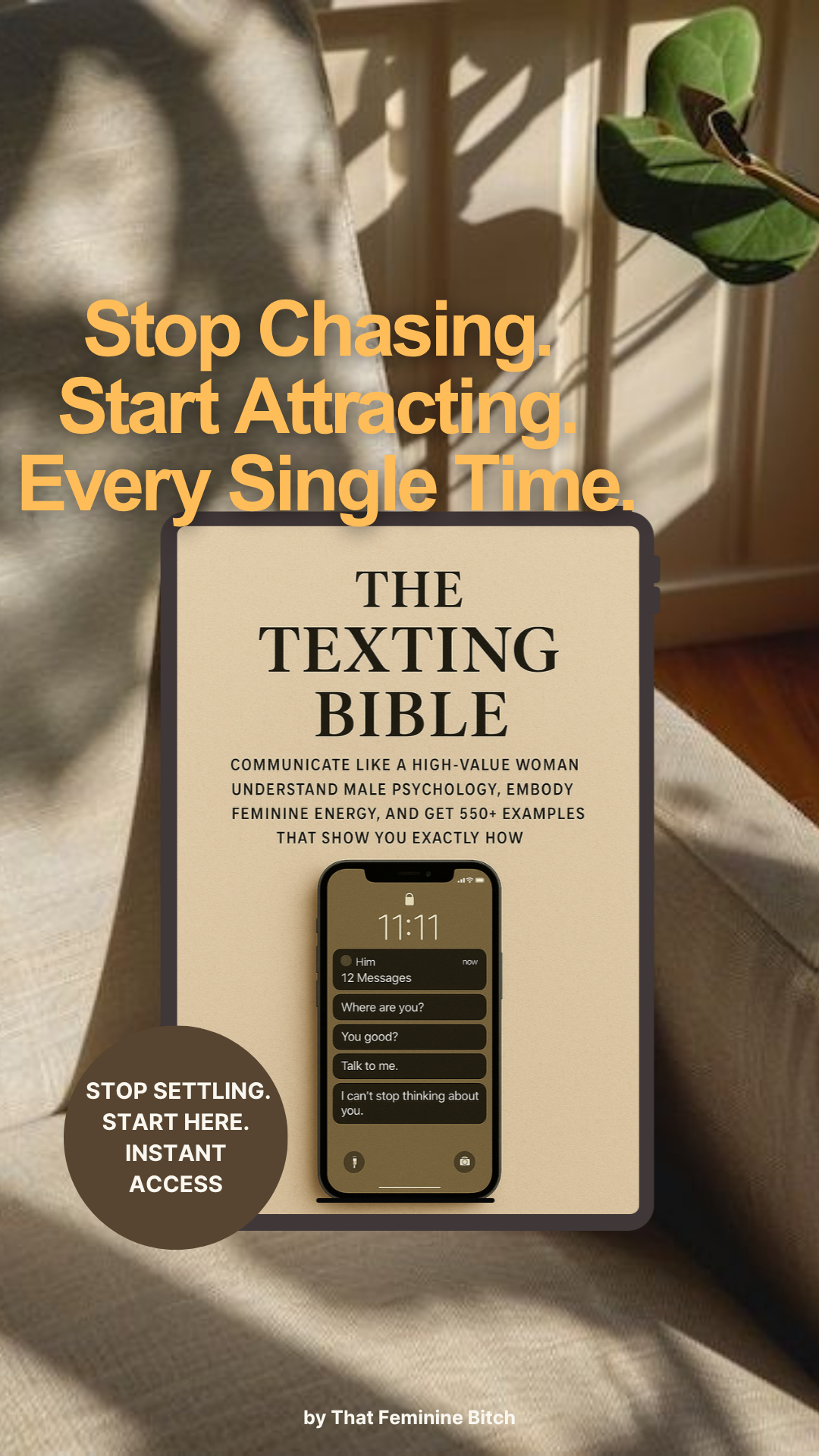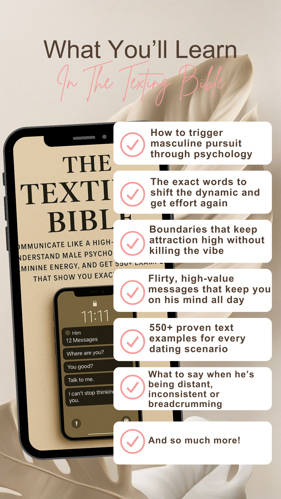 This guide teaches you how to text like a woman who knows her worth. You'll learn male psychology - what triggers pursuit versus what kills it. You'll understand feminine energy communication - how to be warm and magnetic without chasing. And you'll see exactly how it looks in practice with 550+ text examples for every dating scenario.