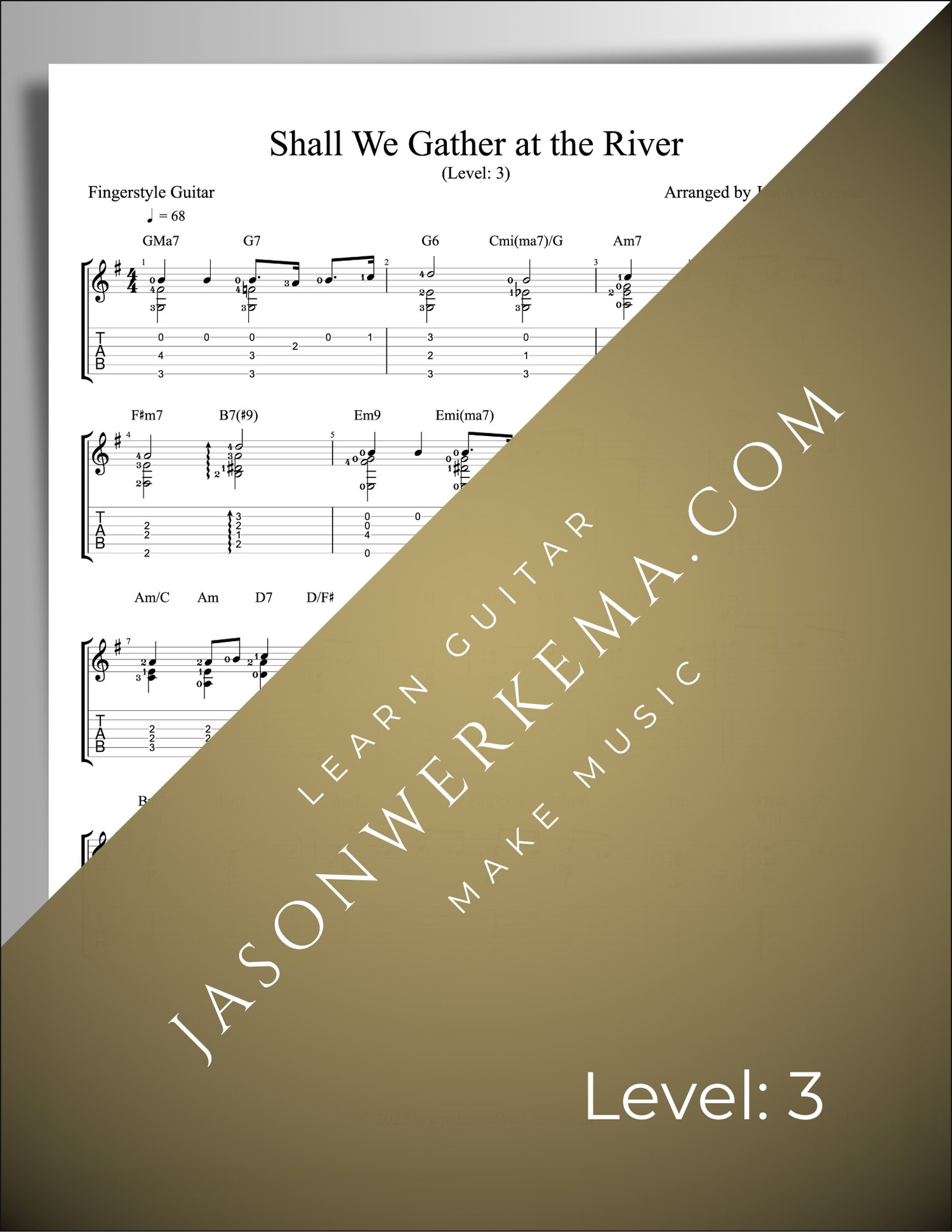 Fingerstyle guitar arrangement of "Shall We Gather at the River" (level 3) with music notation, left-hand fingerings, chord symbols, TABs, and mp3 file.