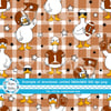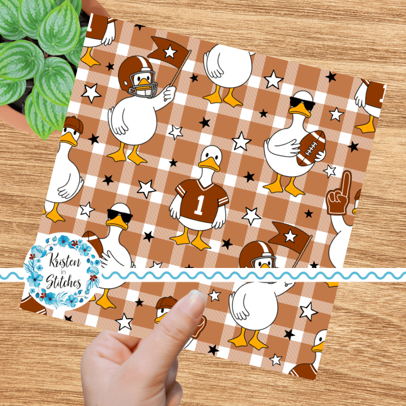 White geese ready for game day! Brown jerseys, helmets, flags and footballs on gingham plaid.